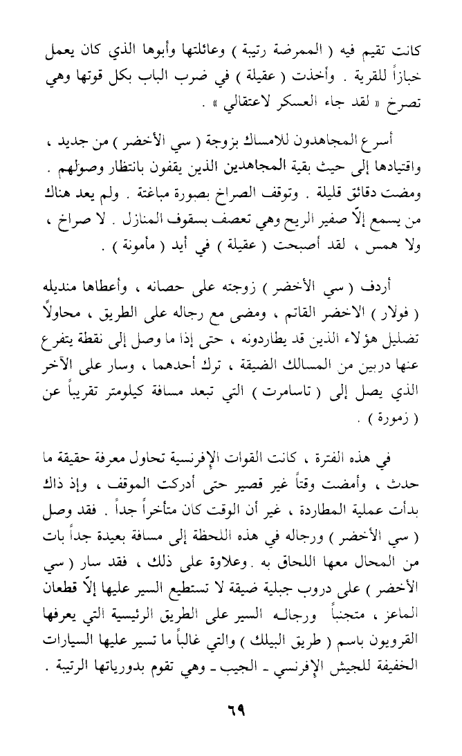 أردف (سي الأخضر) زوجته على حصانه، وأعطاها منديله (فولار) الاخضر القاتم، ومضى مع رجاله على الطريق، محاولا تضليل هؤلاء الذين قد يطاردونه .. حتى إذا ما وصل إلى نقطة يتفرع عنها دربين من المسالك الضيقة، ترك أحدهما، وسار على الآخر الذي يصل إلى (تاسامرت) التي تبعد مسافة كيلومتر تقريبا عن (زمورة).