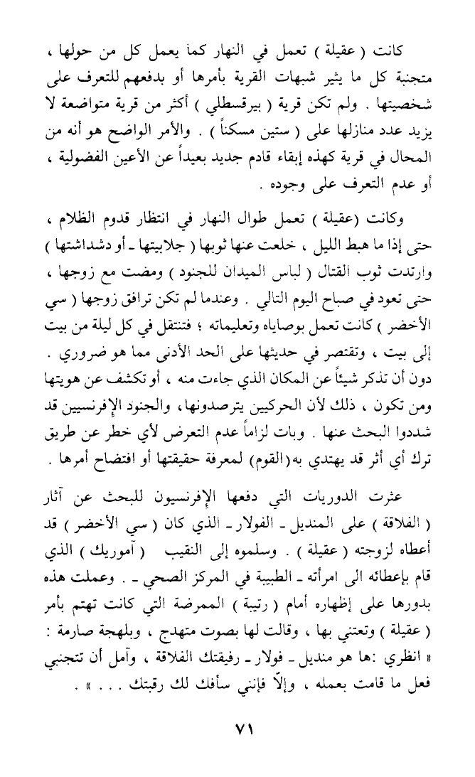 وكانت (عقيلة) تعمل طوال النهار في انتظار قدوم الظلام، حتى إذا ما هبط الليل، خلعت عنها ثوبها (جلابيتها - أو دشداشتها) وارتدت ثوب القتال (لباس الميدان للجنود) ومضت مع زوجها، حتى تعود في صباح اليوم التالي. وعندما لم تكن ترافق زوجها (سي الأخضر) كانت تعمل بوصاياه وتعليماته؛ فتنتقل في كل ليلة من بيت إلى بيت، وتقتصر في حديثها على الحد الأدنى مما هو ضروري. دون أن تذكر شيئا عن المكان الذي جاءت منه، أو تكشف عن هويتها ومن تكون، ذلك لأن الحركيين يترصدونها، والجنود الإفرنسيين قد شددوا البحث عنها. وبات لزاما عدم التعرض لأي خطر عن طريق ترك أي أثر قد يهتدي به (القوم) لمعرفة حقيقتها أو افتضاح أمرها.
