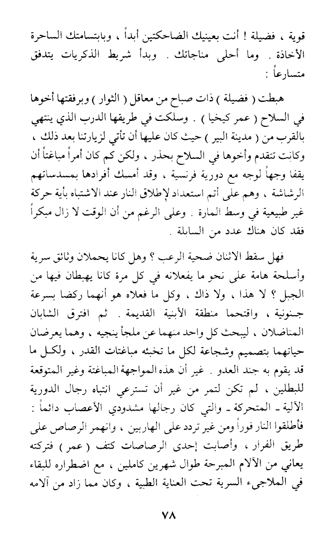 قوية، فضيلة! أنت بعينيك الضاحكتين أبدا، وبابتسامتك الساحرة الأخاذة. وما أحلى مناجاتك. وبدأ شريط الذكريات يتدفق متسارعا: