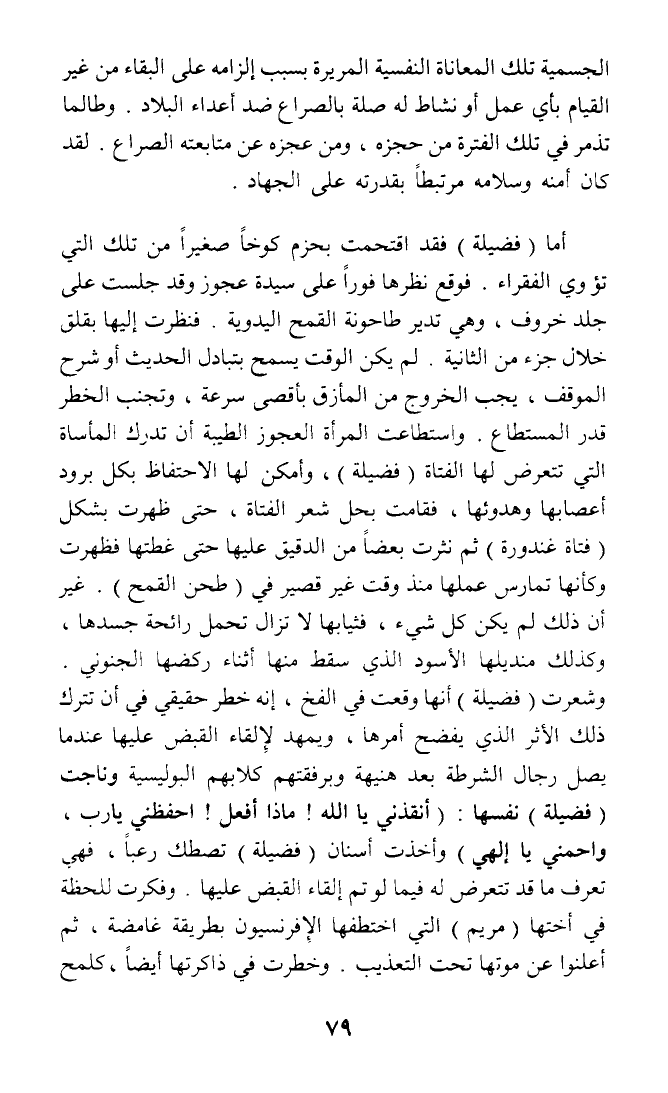 أما (فضيلة) فقد اقتحمت بحزم كوخا صغيرا من تلك التي تؤوي الفقراء. فوقع نظرها فورا على سيدة عجوز وقد جلست على جلد خروف، وهي تدير طاحونة القمح اليدوية. فنظرت إليها بقلق خلال جزء من الثانية. لم يكن الوقت يسمح بتبادل الحديث أو شرح الموقف، يجب الخروج من المأزق بأقصى سرعة، وتجنب الخطر قدر المستطاع. واستطاعت المرأة العجوز الطيبة أن تدرك المأساة التي تتعرض لها الفتاة (فضيلة)، وأمكن لها الاحتفاظ بكل برود أعصابها وهدوئها، فقامت بحل شعر الفتاة، حتى ظهرت بشكل (فتاة غندورة) ثم نثرت بعضا من الدقيق عليها حتى غطتها فظهرت وكأنها تمارس عملها منذ وقت غير قصير في (طحن القمح). غير أن ذلك لم يكن كل شيء، فثيابها لا تزال تحمل رائحة جدها، وكذلك منديلها الأسود الذي سقط منها أثناء ركضها الجنوني. وشعرت (فضيلة) أنها وقعت في الفخ، إنه خطر حقيقي في أن تترك ذلك الأثر الذي يفضح أمرها، ويمهد لإلقاء القبض عليها عندما يصل رجال الشرطة بعد هنيهة وبرفقتهم كلابهم البوليسية وناجت (فضيلة) نفسها: (أنقذني يا الله! ماذا أفعل! احفظي يا رب، واحمني يا إلهي) وأخذت أسنان (فضيلة) تصطك رعبا، فهي تعرف ما قد تتعرض له فيما لو تم إلقاء القبض عليها. وفكرت للحظة في أختها (مريم) التي اختطفها الإفرنسيون بطريقة غامضة، ثم أعلنوا عن موتها تحت التعذيب. وخطرت في ذاكرتها أيضا، كلمح
