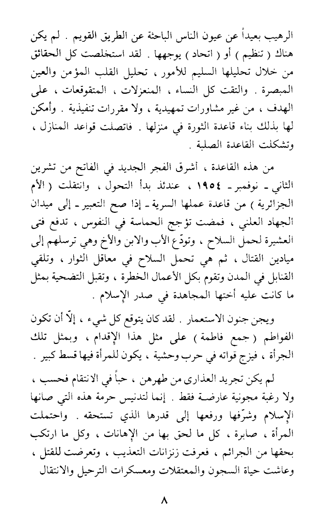 الرهيب بعيدا عن عيون الناس الباحثة عن الطريق القويم. لم يكن هناك (تنظيم) أو (اتحاد) يوجهها. لقد استخلصت كل الحقائق من خلال تحليلها السليم للأمور، تحليل القلب المؤمن والعين المبصرة. والتقت كل النساء، المنعزلات، المتقوقعات، على الهدف، من غير مشاورات تمهيدية، ولا مقررات تنفيذية. وأمكن لها بذلك بناء قاعدة الثورة في منزلها. فاتصلت قواعد المنازل، وتشكلت القاعدة الصلبة.