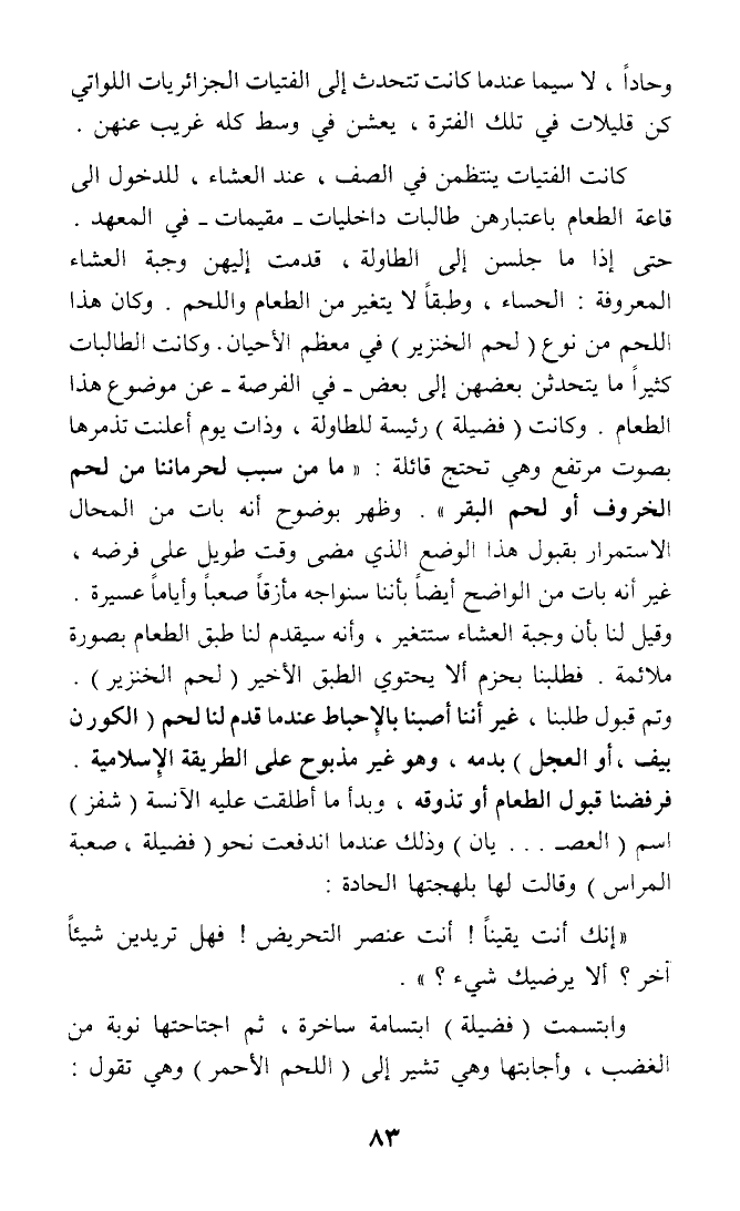 وابتسمت (فضيلة) ابتسامة ساخرة، ثم اجتاحتها نوبة من الغضب، وأجابتها وهي تشير إلى (اللحم الأحمر) وهي تقول: