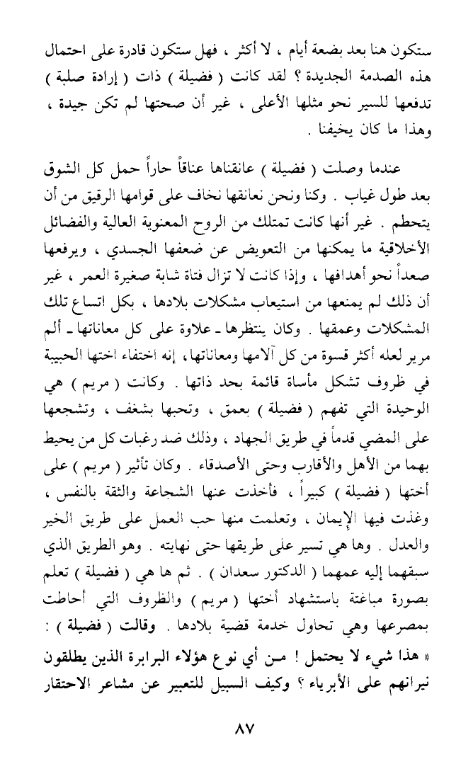 عندما وصلت (فضيلة) عانقناها عناقا حارا حمل كل الشوق بعد طول غياب. وكنا ونحن نعانقها نخاف على قوامها الرقيق من أن يتحطم. غير أنها كانت تمتلك من الروح المعنوية العالية والفضائل الأخلاقية ما يمكنها من التعويض عن ضعفها الجسدي، ويرفعها صعدا نحو أهدافها، وإذا كانت لا تزال فتاة شابة صغيرة العمر، غير أن ذلك لم يمنعها من استيعاب مشكلات بلادها، بكل اتساع تلك المشكلات وعمقها. وكان ينتظرها - علاوة على كل معاناتها - ألم مرير لعله أكثر قسوة من كل آلامها ومعاناتها، إنه اختفاء اختها الحبيبة في ظروف تشكل مأساة قائمة بحد ذاتها. وكانت (مريم) هي الوحيدة التي تفهم (فضيلة) بعمق، وتحبها بشغف، وتشجعها على المضي قدما في طريق الجهاد، وذلك ضد رغبات كل من يحيط بهما من الأهل والأقارب وحتى الأصدقاء. وكان تأثير (مريم) على أختها (فضيلة) كبيرا، فأخذت عنها الشجاعة والثقة بالنفس، وغذت فيها الإيمان، وتعلمت منها حب العمل على طريق الخير والعدل. وها هي تسير على طريقها حتى نهايته. وهو الطريق الذي سبقهما إليه عمهما (الدكتور سعدان). ثم ها هي (فضيلة) تعلم بصورة مباغتة باستشهاد أختها (مريم) والظروف التي أحاطت بمصرعها وهي تحاول خدمة قضية بلادها. وقالت (فضيلة): (هذا شيء لا يحتمل! من أي نوع هؤلاء البرابرة الذين يطلقون نيرانهم على الأبرياء؟ وكيف السبيل للتعبير عن مشاعر الاحتقار