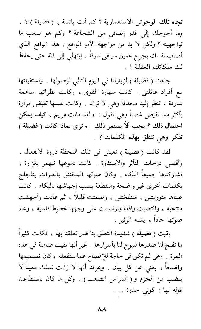 تجاه تلك الوحوش الاستعمارية؟ كم أنت بائسة يا (فضيلة)؟. وما أحوجك إلى قدر إضافي من الشجاعة؟ وكم هو صعب ما تواجهينه؟ ولكن لا بد من مواجهة الأمر الواقع، هذا الواقع الذي أصاب نفسك بجرح عميق سيبقى نازفا. إبتهلي إلى الله حتى يحفظ لك ملكاتك العقلية!.