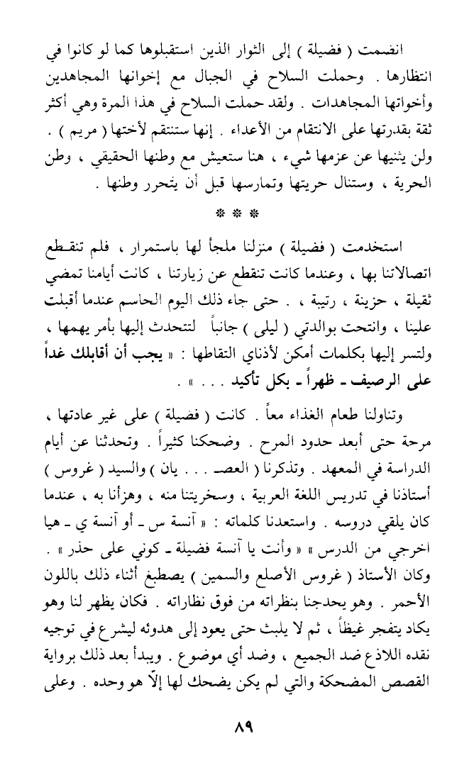 وتناولنا طعام الغذاء معا. كانت (فضيلة) على غير عادتها، مرحة حتى أبعد حدود المرح. وضحكنا كثيرا. وتحدثنا عن أيام الدراسة في المعهد. وتذكرنا (العصـ ... يان) والسيد (غروس) أستاذنا في تدريس اللغة العربية، وسخريتنا منه، وهزأنا به، عندما كان يلقي دروسه. واستعدنا كلماته: (آنسة سس - أو آنسة ي - هيا اخرجي من الدرس) (وأنت يا آنسة فضيلة - كوني على حذر). وكان الأستاذ (غروس الأصلع والسمين) يصطبغ أثناء ذلك باللون الأحمر. وهو يحدجنا بنظراته من فوق نظاراته. فكان يظهر لنا وهو يكاد يتفجر غيظا، ثم لا يلبث حتى يعود إلى هدوئه ليشرع في توجيه نقده اللاذع ضد الجميع، وضد أي موضوع. ويبدأ بعد ذلك برواية القصص المضحكة والتي لم يكن يضحك لها إلا هو وحده. وعلى