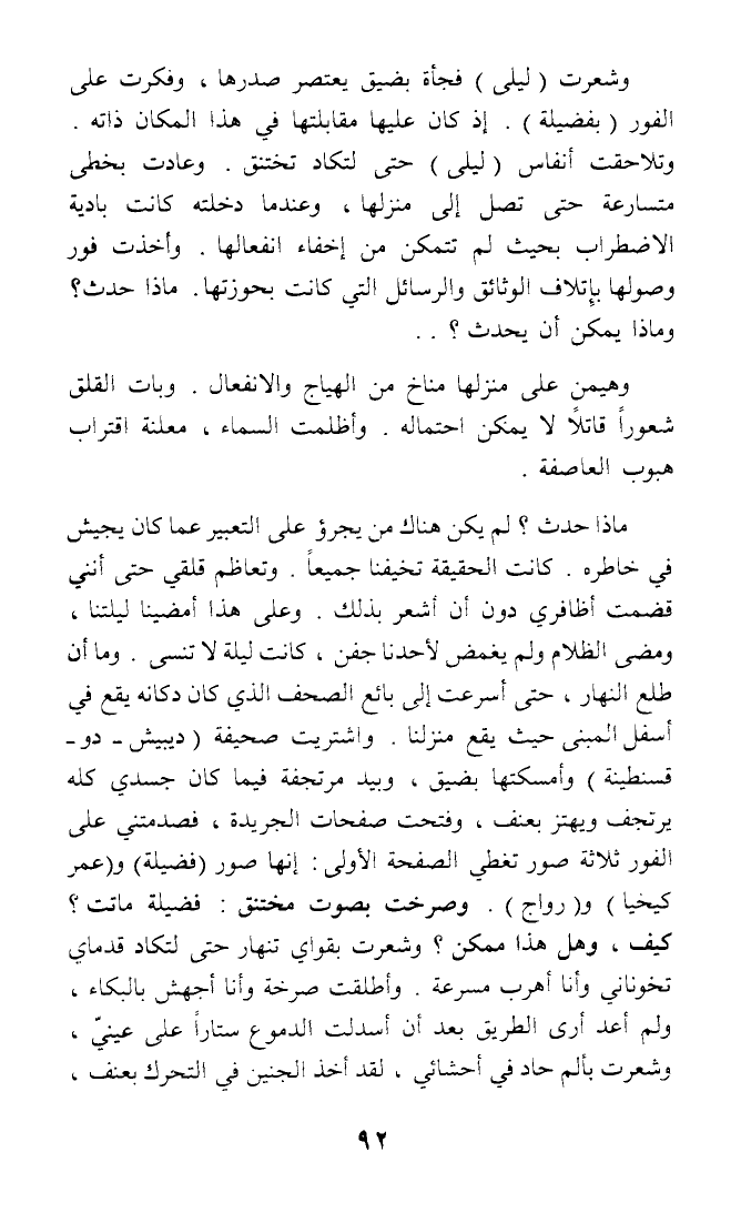 وشعرت (ليلى) فجأة بضيق يعتصر صدرها، وفكرت على الفور (بفضيلة). إذ كان عليها مقابلتها في هذا المكان ذاته. وتلاحقت أنفاس (ليلى) حتى لتكاد تختنق. وعادت بخطى متسارعة حتى تصل إلى منزلها، وعندما دخلته كانت بادية الاضطراب بحيث لم تتمكن من إخفاء انفعالها. وأخذت فور وصولها بإتلاف الوثائق والرسائل التي كانت بحوزتها. ماذا حدث؟ وماذا يمكن أن يحدث؟ ..