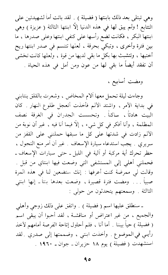 - سنطلق عليها اسم (فضيلة). واتفق على ذلك زوجي وأهلي والجميع، من غير اعتراض أو مناقشة، لقد أحبوا أن يبقى اسم (فضيلة) حيا بيننا. أما أنا، فلم أحاول إتاحة الفرصة أمامهم لأخذ رأيي في الموضوع. وأخذت ابنتي، وضممتها إلى صدري. لقد استشهدت (فضيلة) يوم 18 حزيران - جوان - 1960.