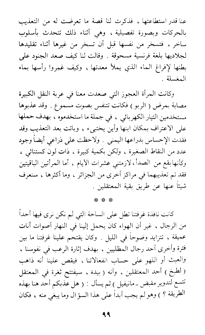 وكانت المرأة العجوز التي صعدت معنا في عربة النقل الكبيرة مصابة بمرض (الربو) فكانت تتنفس بصوت مسموع. وقد عذبوها مستخدمين التيار الكهربائي، في جملة ما استخدموه، بهدف حملها على الاعتراف بمكان ابنها وأين يختبىء، وباتت بعد التعذيب وقد فقدت الإحساس بذراعها اليمنى. ولاحظت على ذراعي أيضا وجود عدد من النقاط الصغيرة، ولكن بكمية كبيرة، ذات لون كستنائي، وكأنها بقع من الصدأ، لازمتني عشرات الأيام، أما المرأتين الباقيتين فقد تم تعذيبهما في مراكز أخرى من الجزائر، وما أكثرها، سنعرف شيئا عنها عن طريق بقية المعتقلين.