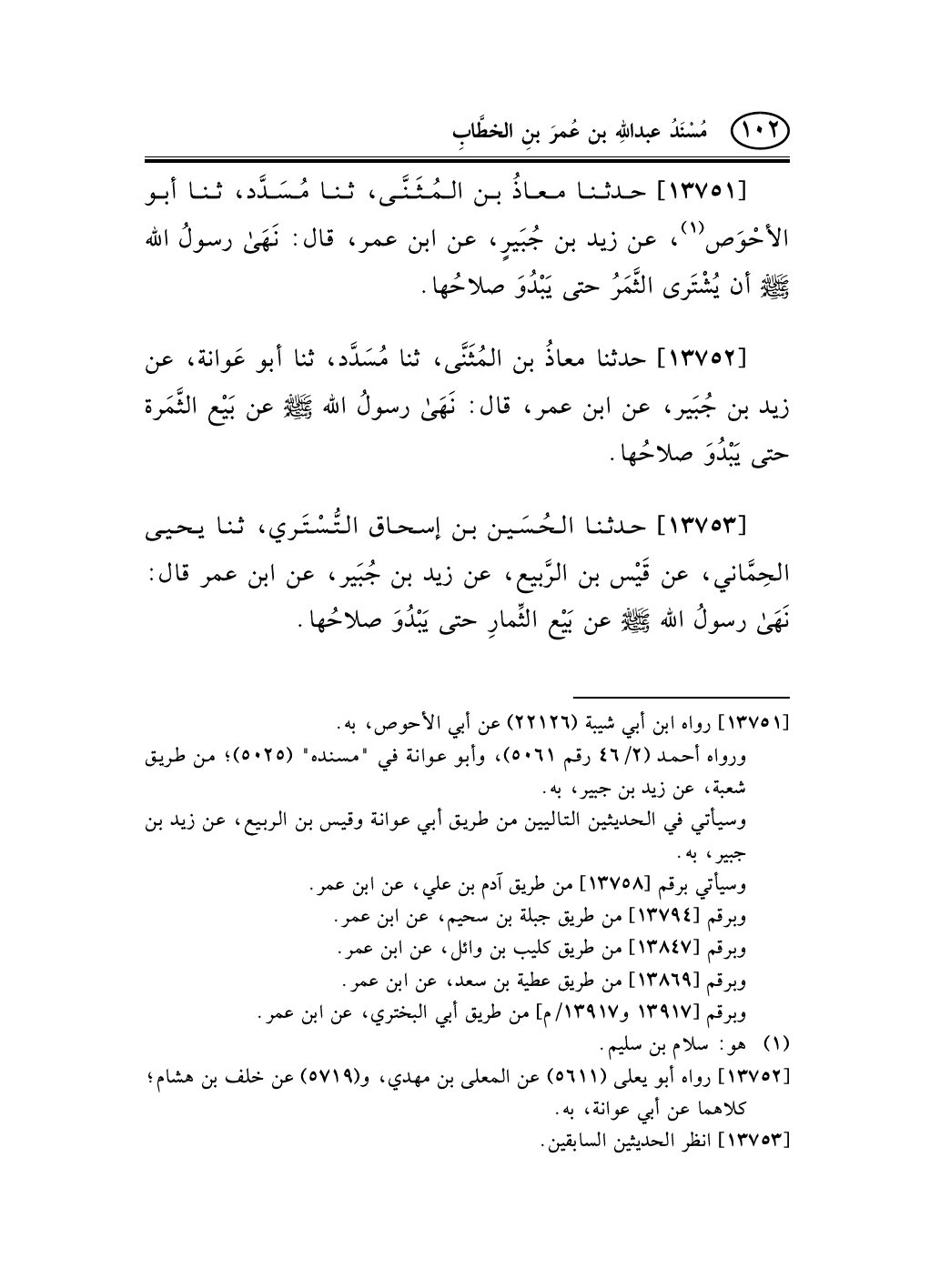 13751 - حدثنا معاذُ بن المُثَنَّى، ثنا مُسَدَّد، ثنا أبو الأحْوَص (¬1) ، عن زيد بن جُبَيرٍ، عن ابن عمر، قال: نَهَى رسولُ الله صلى الله عليه وسلم أن يُشْتَرى الثَّمَرُ حتى يَبْدُوَ صلاحُها.