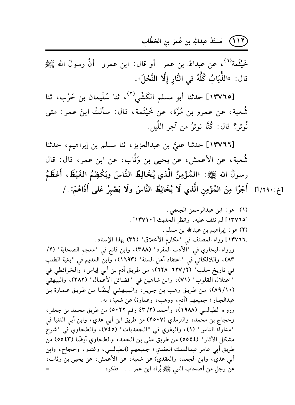 13766 - حدثنا عليُّ بن عبد العزيز، ثنا مسلم بن إبراهيم، حدثنا شُعبة، عن الأعمش، عن يحيى بن وَثَّاب، عن ابن عمر، قال: قال رسولُ الله صلى الله عليه وسلم: «المُؤْمِنُ الَّذي يُخَالِطُ النَّاسَ ويَكْظِمُ الغَيْظَ، أَعْظَمُ أَجْرًا مِنَ المُؤْمِنِ الَّذي لاَ يُخَالِطُ النَّاسَ ولاَ يَصْبِرُ عَلى أَذَاهُمْ» . /