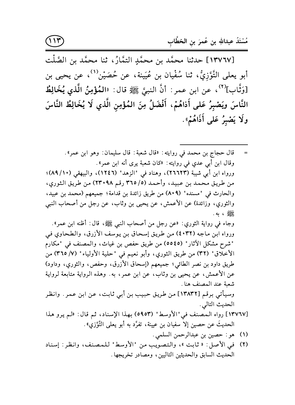 13767 - حدثنا محمَّد بن محمَّدٍ التمَّارُ، ثنا محمَّد بن الصَّلْت أبو يعلى التَّوَّزِيُّ، ثنا سُفْيان بن عُيَينة، عن حُصَيْن (¬1) ، عن يحيى بن [وَثَّاب] (¬2) ، عن ابن عمر: أنَّ النبيَّ صلى الله عليه وسلم قال: «المُؤْمِنُ الَّذي يُخَالِطُ النَّاسَ ويَصْبِرُ عَلى أَذاهُمْ، أَفْضَلُ مِنَ المُؤْمِنِ الَّذي لاَ يُخَالِطُ النَّاسَ ولاَ يَصْبِرُ عَلى أَذَاهُمْ» .