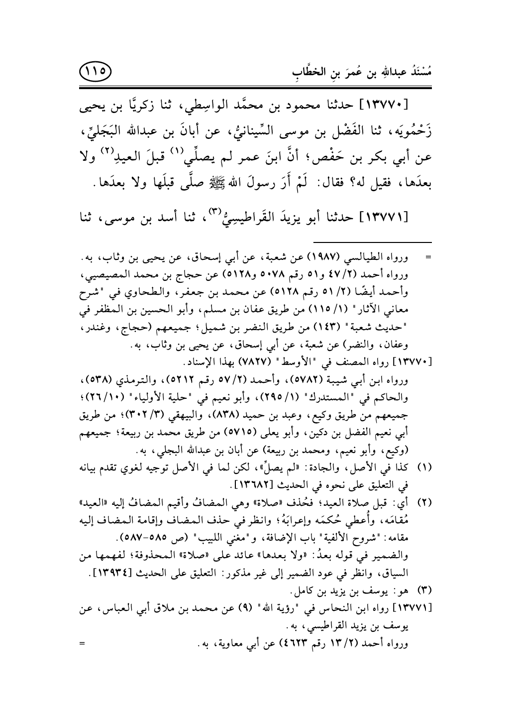 13770 - حدثنا محمود بن محمَّد الواسِطي، ثنا زكريَّا بن يحيى زَحْمُويَه، ثنا الفَضْل بن موسى السِّينانيُّ، عن أبانَ بن عبد الله البَجَليِّ، عن أبي بكر بن حَفْص؛ أنَّ ابنَ عمر لم يصلِّي (¬1) قبلَ العيدِ (¬2) ولا بعدَها، فقيل له؟ فقال: لَمْ أَرَ رسولَ الله صلى الله عليه وسلم صلَّى قبلَها ولا بعدَها.