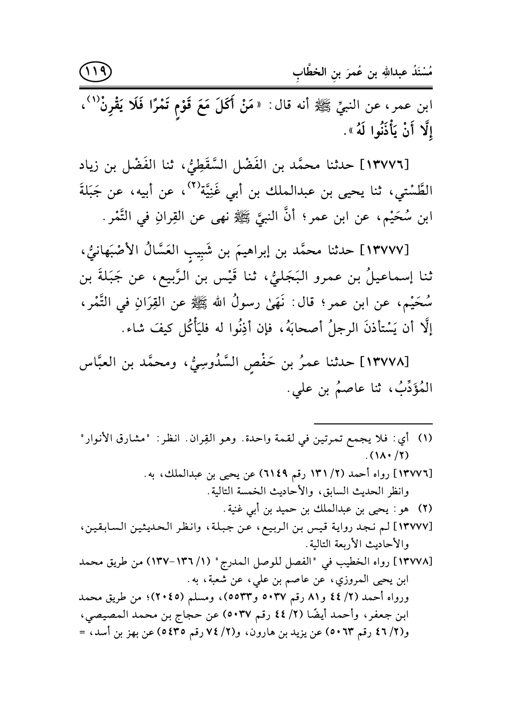 13776 - حدثنا محمَّد بن الفَضْل السَّقَطِيُّ، ثنا الفَضْل بن زياد الطَّسْتي، ثنا يحيى بن عبد الملك بن أبي غَنِيَّة (¬1) ، عن أبيه، عن جَبَلةَ ابن سُحَيْم، عن ابن عمر؛ أنَّ النبيَّ صلى الله عليه وسلم نهى عن القِرانِ في التَّمْر.