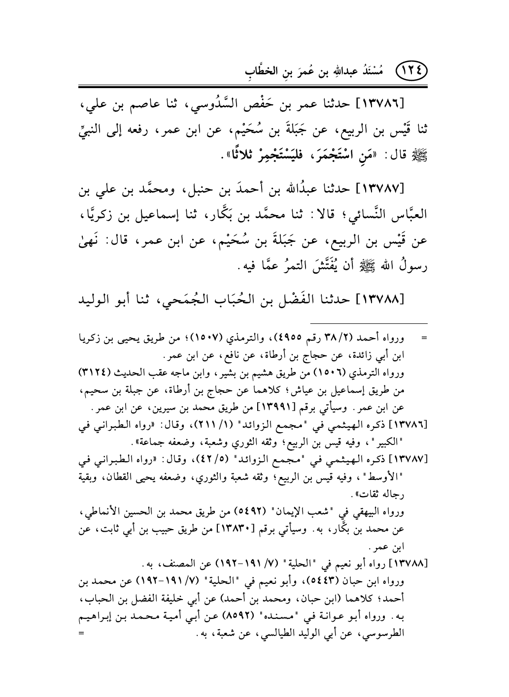 13786 - حدثنا عمر بن حَفْص السَّدُوسي، ثنا عاصم بن علي، ثنا قَيْس بن الربيع، عن جَبَلةَ بن سُحَيْم، عن ابن عمر، رفعه إلى النبيِّ صلى الله عليه وسلم قال: «مَنِ اسْتَجْمَرَ، فليَسْتَجْمِرْ ثلاثًا» .