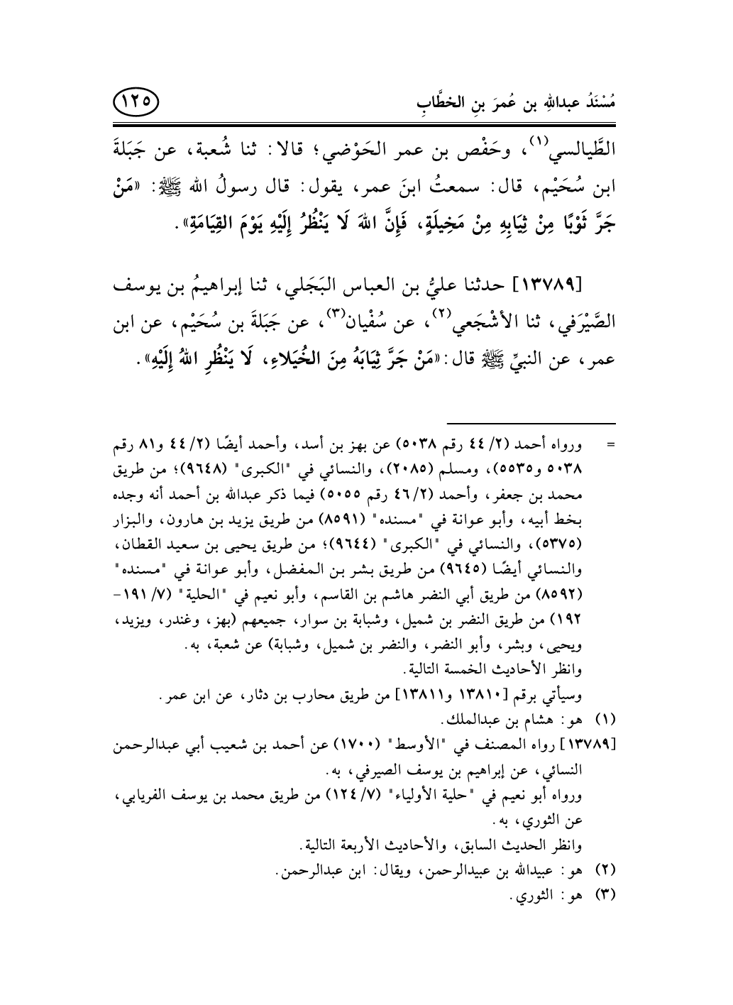 13789 - حدثنا عليُّ بن العباس البَجَلي، ثنا إبراهيمُ بن يوسف الصَّيْرَفي، ثنا الأشْجَعي (¬1) ، عن سُفْيان (¬2) ، عن جَبَلةَ بن سُحَيْم، عن ابن عمر، عن النبيِّ صلى الله عليه وسلم قال: «مَنْ جَرَّ ثِيَابَهُ مِنَ الخُيَلاءِ، لاَ يَنْظُرِ اللهُ إِلَيْهِ» .