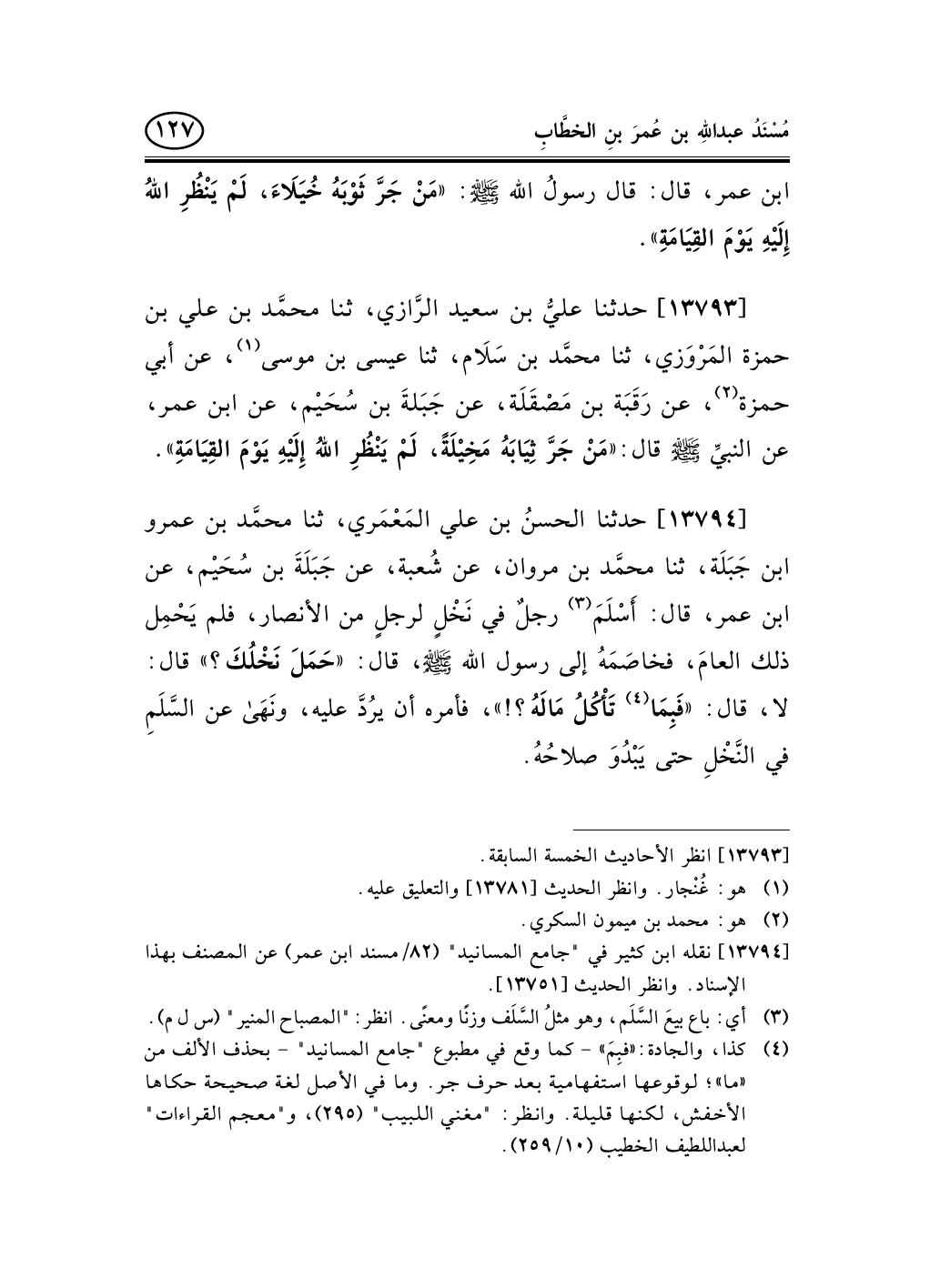 13793 - حدثنا عليُّ بن سعيد الرَّازي، ثنا محمَّد بن علي بن حمزة المَرْوَزي، ثنا محمَّد بن سَلاَم، ثنا عيسى بن موسى (¬1) ، عن أبي حمزة (¬2) ، عن رَقَبَة بن مَصْقَلَة، عن جَبَلةَ بن سُحَيْم، عن ابن عمر، عن النبيِّ صلى الله عليه وسلم قال: «مَنْ جَرَّ ثِيَابَهُ مَخِيْلَةً، لَمْ يَنْظُرِ اللهُ إِلَيْهِ يَوْمَ القِيَامَةِ» .