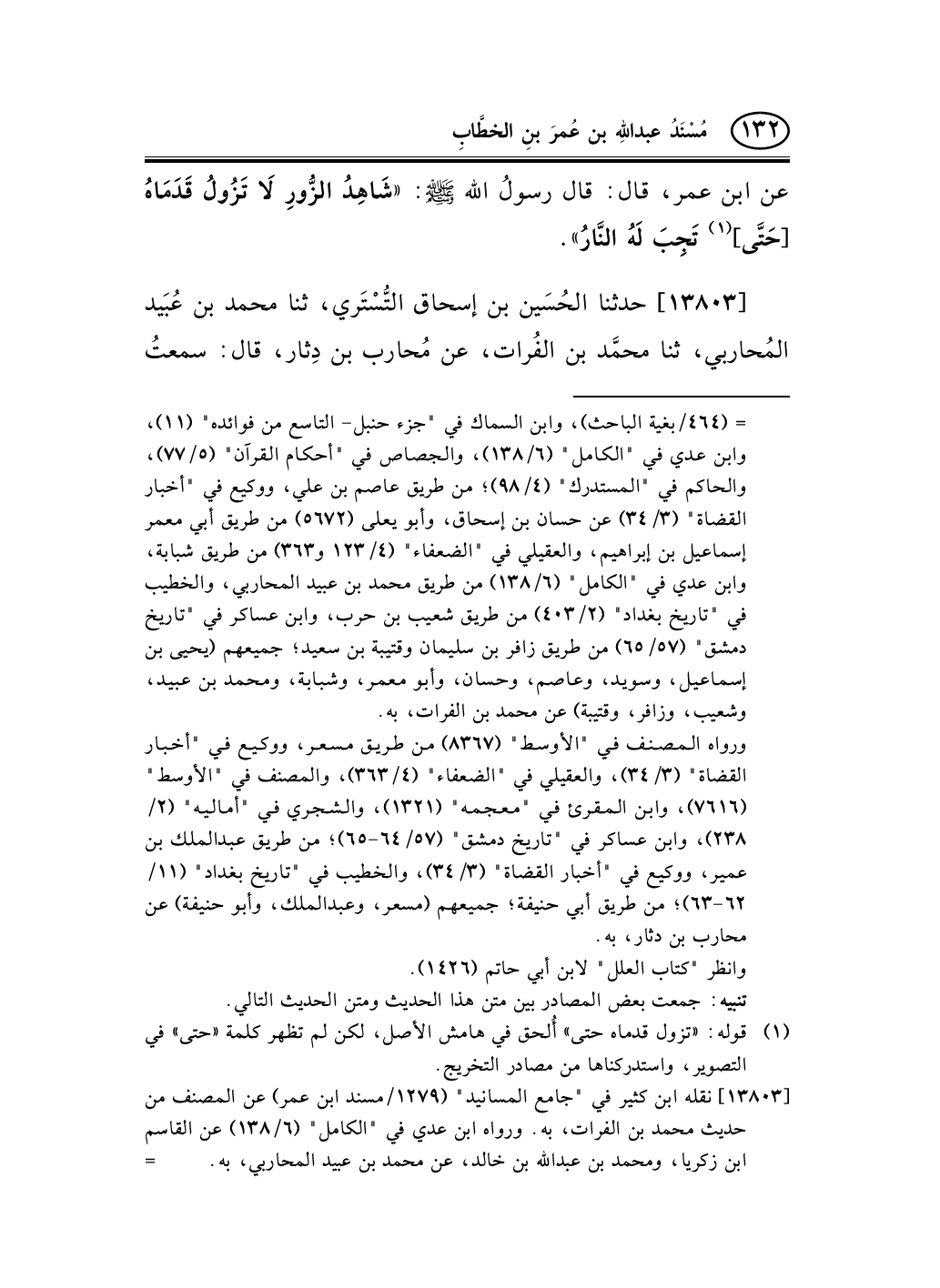 [13803] نقله ابن كثير في "جامع المسانيد" (1279/مسند ابن عمر) عن المصنف من حديث محمد بن الفرات، به. ورواه ابن عدي في "الكامل" (6/138) عن القاسم ابن زكريا، ومحمد بن عبد الله بن خالد، عن محمد بن عبيد المحاربي، به. -[133]-