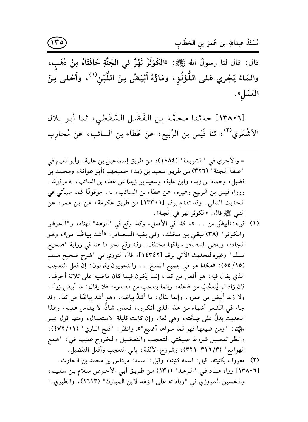 13806 - حدثنا محمَّد بن الفَضْل السَّقَطي، ثنا أبو بلال الأشْعَري (¬1) ، ثنا قَيْس بن الرَّبيع، عن عَطاء بن السائب، عن مُحارِب -[136]- ابن دِثار، عن ابن عمر؛ في قول الله جلَّ ذكرُه: {إِنَّا أَعْطَيْنَاكَ الْكَوْثَرَ *} (¬2) ؛ قال: نَهْرٌ في الجنَّة مَحْفوفٌ بالذَّهَب، يجري ماؤه على الياقوت والدُّرِّ، أبيَضُ من اللَّبَن (¬3) ، وأحلى من العَسَل.