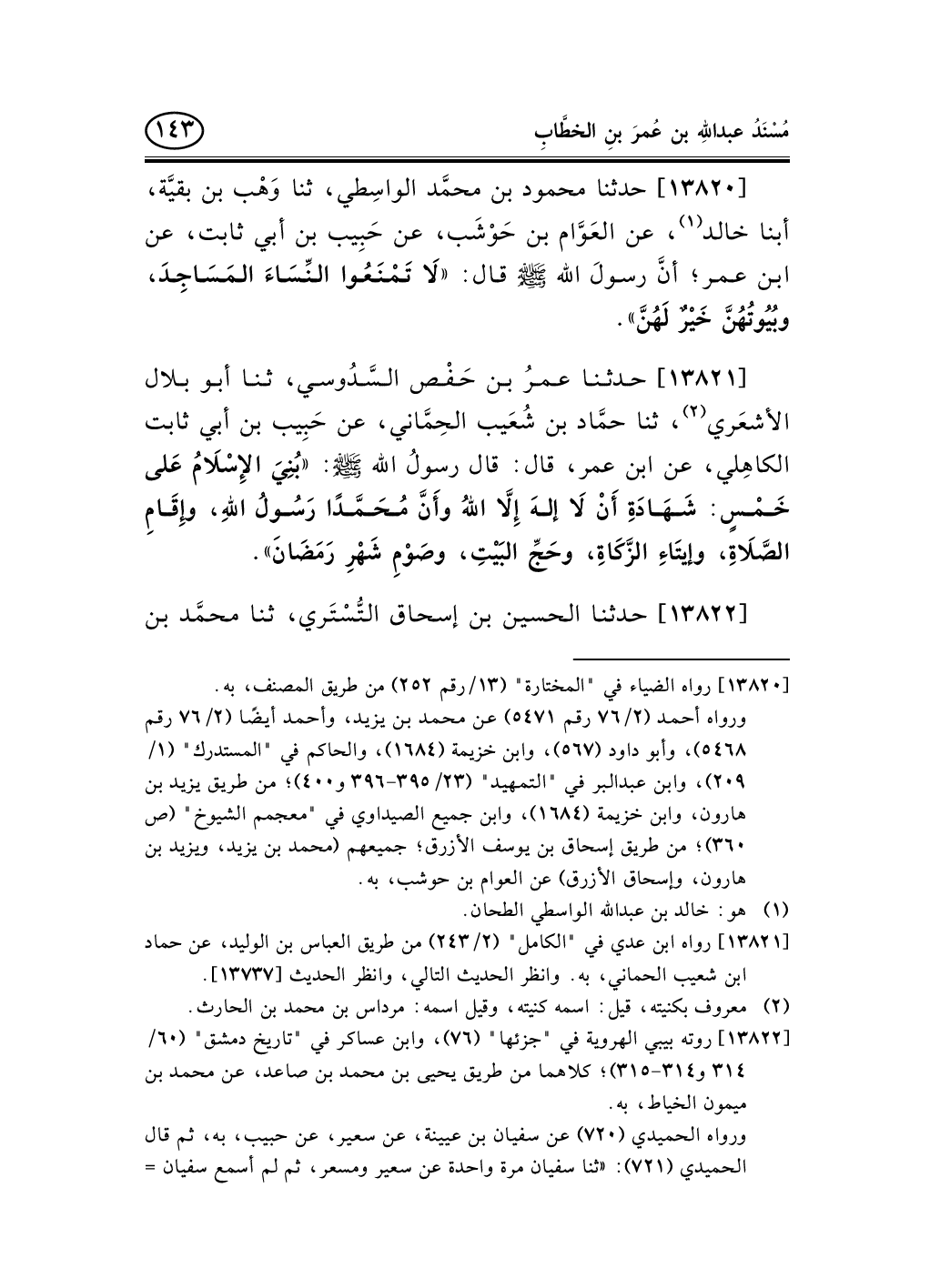 13822 - حدثنا الحسين بن إسحاق التُّسْتَري، ثنا محمَّد بن -[144]- مَيمون الخيَّاط المكِّي، ثنا سُفيان بن عُيَيْنَة، عن سُعَير بن الخِمْس، ومِسْعَر بن كِدام، عن حَبِيب بن أبي ثابت، عن ابن عمر، عن النبيِّ صلى الله عليه وسلم؛ مثلَه.