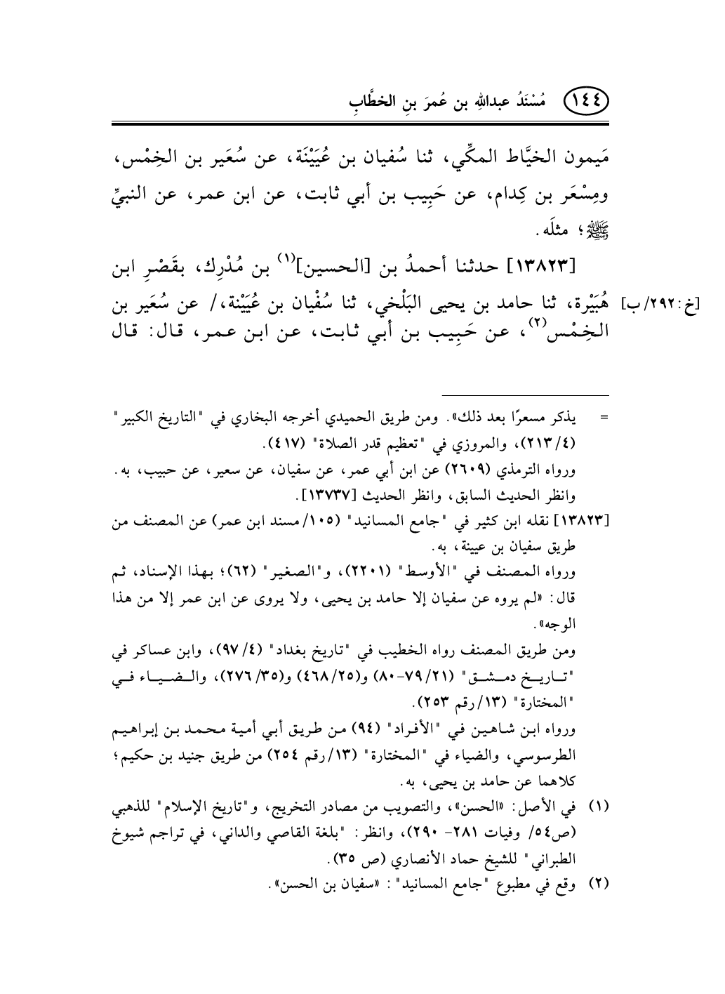 13823 - حدثنا أحمدُ بن [الحسين] (¬1) بن مُدْرِك، بقَصْرِ ابن هُبَيْرة، ثنا حامد بن يحيى البَلْخي، ثنا سُفْيان بن عُيَيْنة، / عن سُعَير بن [خ: 292/ب]