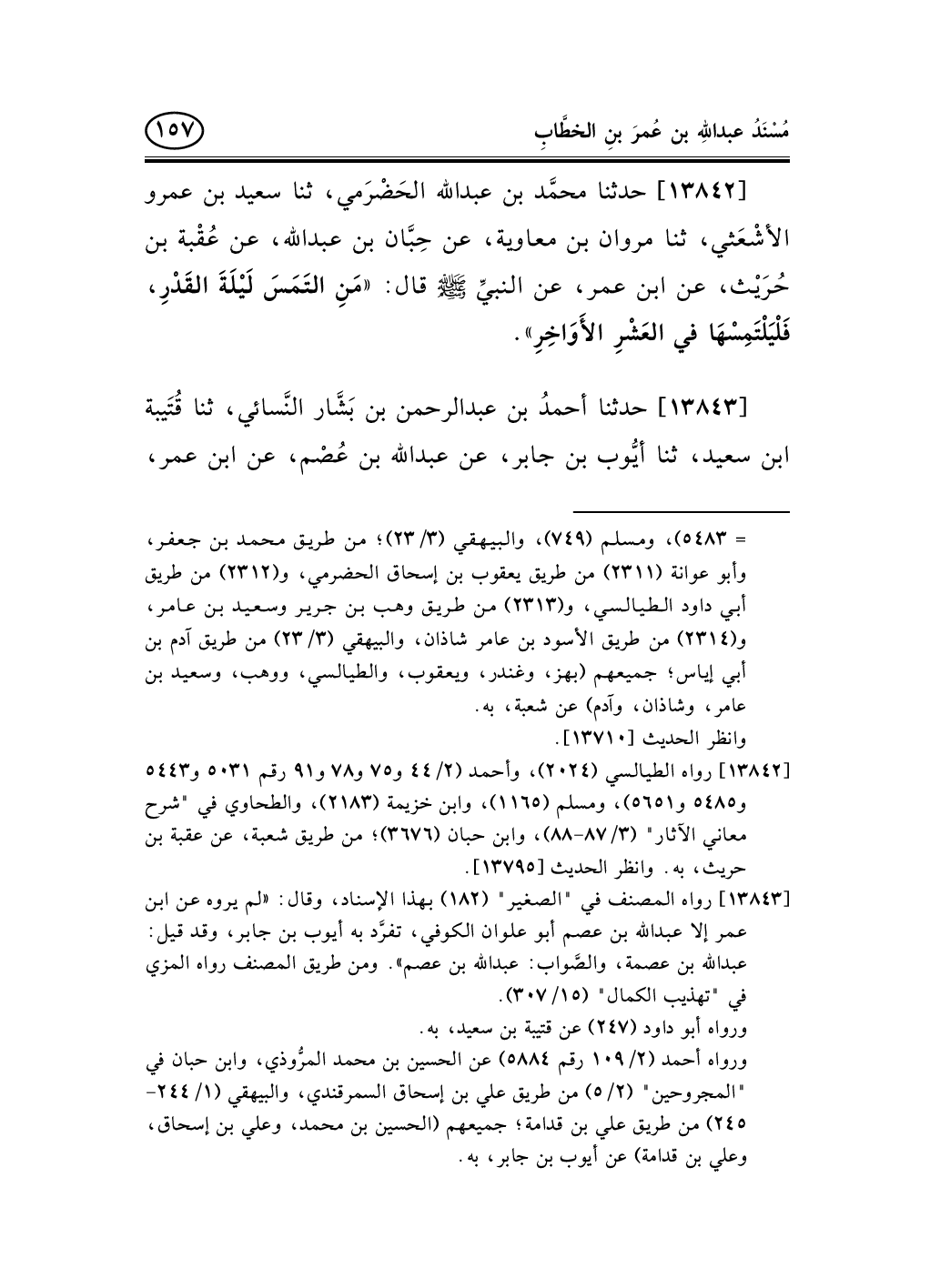 13842 - حدثنا محمَّد بن عبد الله الحَضْرَمي، ثنا سعيد بن عمرو الأشْعَثي، ثنا مروان بن معاوية، عن حِبَّان بن عبد الله، عن عُقْبة بن حُرَيْث، عن ابن عمر، عن النبيِّ صلى الله عليه وسلم قال: «مَنِ التَمَسَ لَيْلَةَ القَدْرِ، فَلْيَلْتَمِسْهَا في العَشْرِ الأَوَاخِرِ» .
