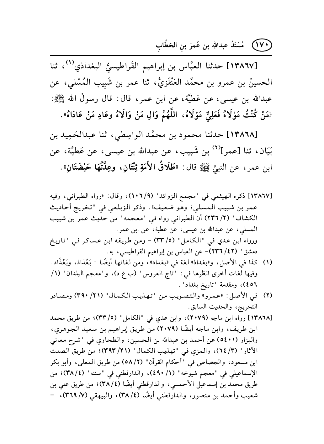 13867 - حدثنا العبَّاس بن إبراهيم القَراطيسيُّ البغداذي (¬1) ، ثنا الحسينُ بن عمرو بن محمَّد العَنْقَزيُّ، ثنا عمر بن شَبِيب المُسْلي، عن عبد الله بن عيسى، عن عَطيَّة، عن ابن عمر، قال: قال رسولُ الله صلى الله عليه وسلم: «مَنْ كُنْتُ مَوْلاَهُ فَعَلِيٌّ مَوْلاَهُ، اللَّهُمَّ وَالِ مَنْ وَالاَهُ وعَادِ مَنْ عَادَاهُ» .