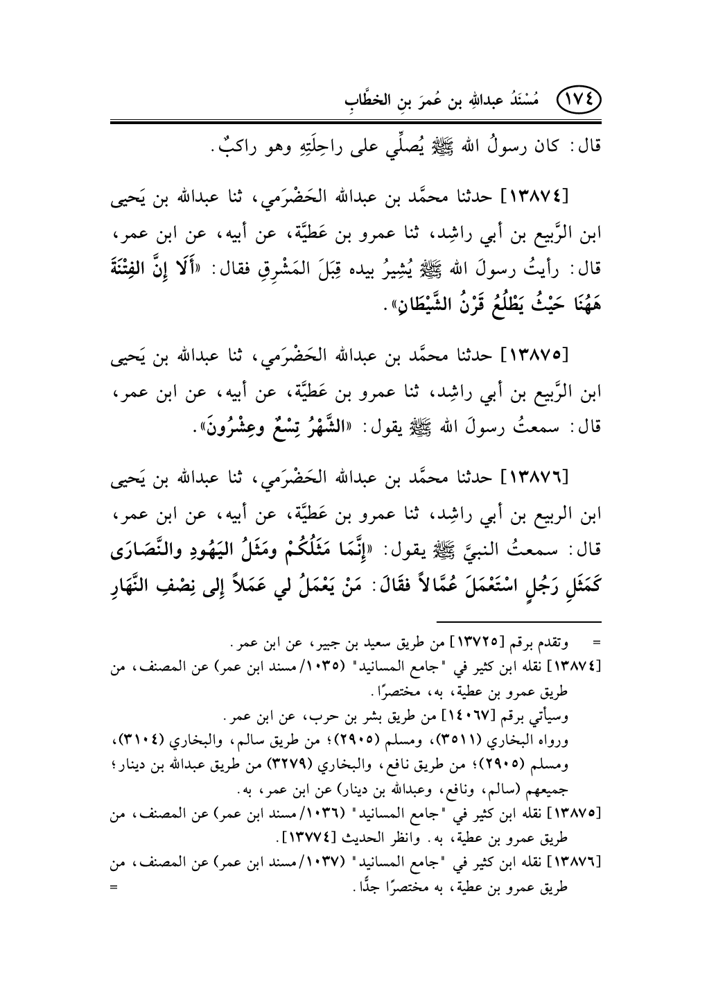[13875] نقله ابن كثير في "جامع المسانيد" (1036/مسند ابن عمر) عن المصنف، من طريق عمرو بن عطية، به. وانظر الحديث [13774] .