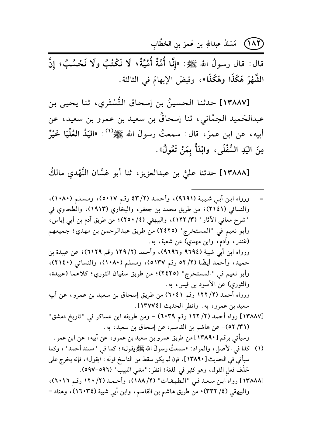 13887 - حدثنا الحسينُ بن إسحاق التُّسْتَري، ثنا يحيى بن عبد الحَميد الحِمَّاني، ثنا إسحاقُ بن سعيد بن عمرو بن سعيد، عن أبيه، عن ابن عمرَ، قال: سمعتُ رسولَ الله صلى الله عليه وسلم (¬1) : «اليَدُ العُلْيَا خَيْرٌ مِنَ اليَدِ السُّفْلَى، وابْدَأْ بِمَنْ تَعُولُ» .