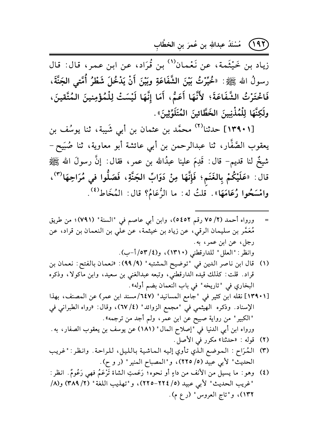 13901 - حدثنا (¬1) محمَّد بن عثمان بن أبي شَيبة، ثنا يوسُف بن يعقوب الصَّفَّار، ثنا عبد الرحمن بن أبي عائشة أبو معاوية، ثنا صُبَيح - شيخٌ لنا قديم- قال: قَدِمَ علينا عبدُالله بن عمر، فقال: إنَّ رسولَ الله صلى الله عليه وسلم قال: «عَلَيْكُمْ بِالغَنَمِ؛ فَإِنَّهَا مِنْ دَوَابِّ الجَنَّةِ، فَصَلُّوا في مُرَاحِهَا (¬2) ، وامْسَحُوا رُعَامَهَا» . قلتُ له: ما الرُّعَامُ؟ قال: المُخَاط (¬3) .