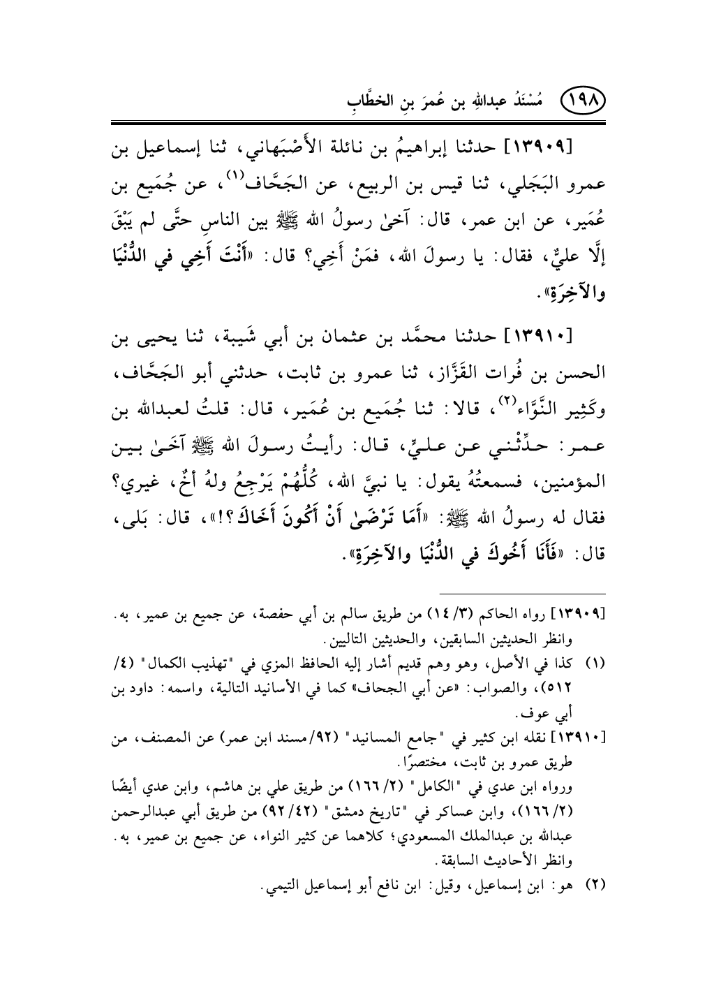 13909 - حدثنا إبراهيمُ بن نائلة الأَصْبَهاني، ثنا إسماعيل بن عمرو البَجَلي، ثنا قيس بن الربيع، عن الجَحَّاف (¬1) ، عن جُمَيع بن عُمَير، عن ابن عمر، قال: آخى رسولُ الله صلى الله عليه وسلم بين الناسِ حتَّى لم يَبْقَ إلاَّ عليٌّ، فقال: يا رسولَ الله، فمَنْ أَخِي؟ قال: «أَنْتَ أَخِي في الدُّنْيَا والآخِرَةِ» .