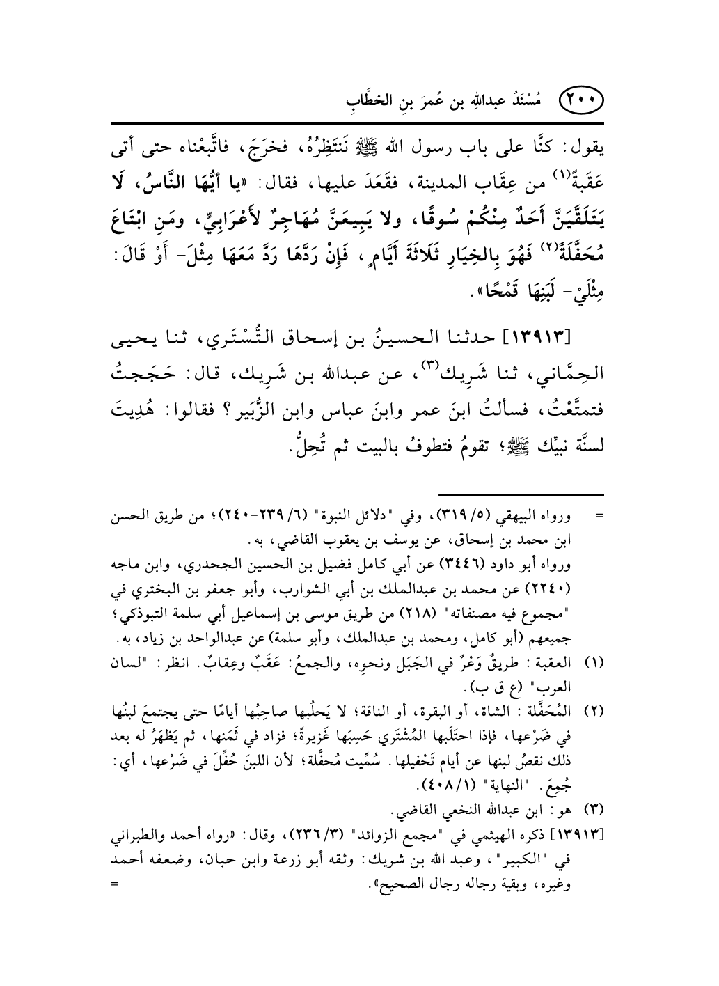 13913 - حدثنا الحسينُ بن إسحاق التُّسْتَري، ثنا يحيى الحِمَّاني، ثنا شَرِيك (¬1) ، عن عبد الله بن شَرِيك، قال: حَجَجتُ فتمتَّعْتُ، فسألتُ ابنَ عمر وابنَ عباس وابن الزُّبَير؟ فقالوا: هُدِيتَ لسنَّة نبيِّك صلى الله عليه وسلم؛ تقومُ فتطوفُ بالبيت ثم تُحِلُّ.
