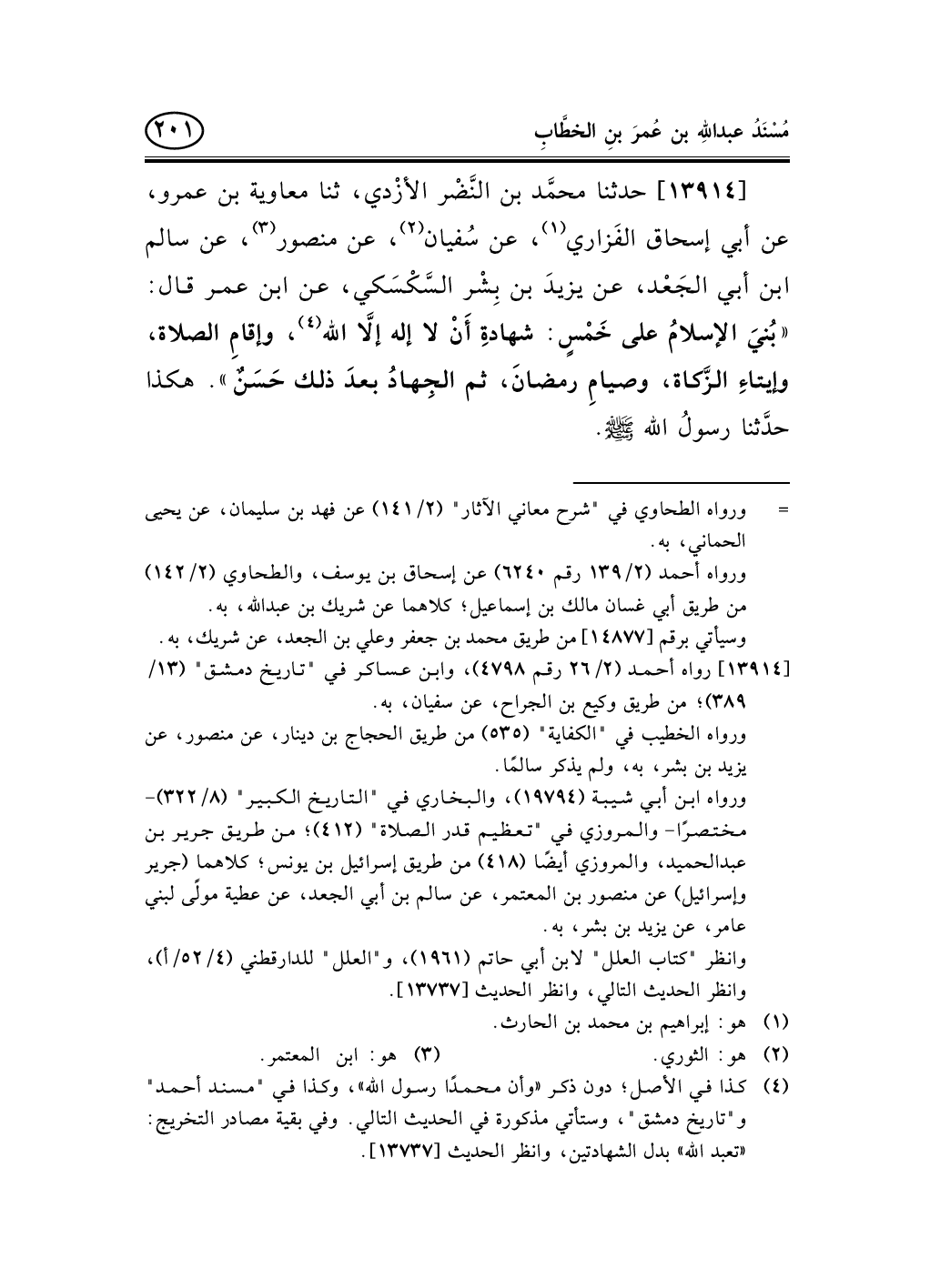 13914 - حدثنا محمَّد بن النَّضْر الأزْدي، ثنا معاوية بن عمرو، عن أبي إسحاق الفَزاري (¬1) ، عن سُفيان (¬2) ، عن منصور (¬3) ، عن سالم ابن أبي الجَعْد، عن يزيدَ بن بِشْر السَّكْسَكي، عن ابن عمر قال: «بُنيَ الإسلامُ على خَمْسٍ: شهادةِ أَنْ لا إله إلاَّ الله (¬4) ، وإقامِ الصلاة، وإيتاءِ الزَّكاة، وصيامِ رمضانَ، ثم الجِهادُ بعدَ ذلك حَسَنٌ» . هكذا حدَّثنا رسولُ الله صلى الله عليه وسلم.