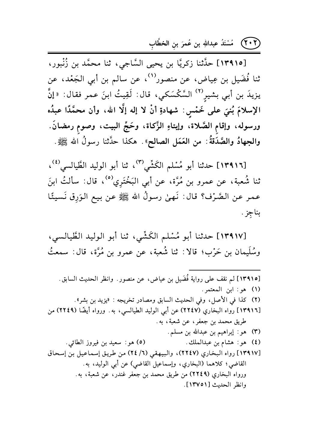 13915 - حدَّثنا زكريَّا بن يحيى السَّاجي، ثنا محمَّد بن زُنْبور، ثنا فُضَيل بن عِياض، عن منصور (¬1) ، عن سالم بن أبي الجَعْد، عن يزيدَ بن أبي بشيرٍ (¬2) السَّكْسَكي، قال: لَقِيتُ ابنَ عمر فقال: «إنَّ الإسلامَ بُنيَ على خَمْسٍ: شهادةِ أنْ لا إله إلاَّ الله، وأن محمَّدًا عبدُه ورسوله، وإقامِ الصَّلاة، وإيتاءِ الزَّكاة، وحَجِّ البيت، وصومِ رمضانَ. والجهادُ والصَّدَقةُ: من العَمَل الصالح» . هكذا حدَّثنا رسولُ الله صلى الله عليه وسلم.