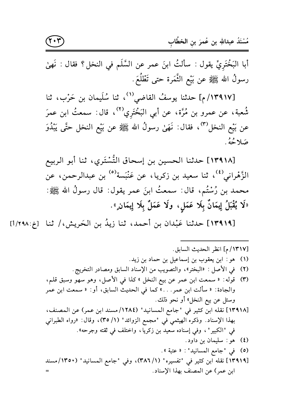 13918 - حدثنا الحسين بن إسحاق التُّسْتَري، ثنا أبو الربيع الزَّهْراني (¬1) ، ثنا سعيد بن زكريا، عن عَنْبَسة (¬2) بن عبد الرحمن، عن محمد بن رُسْتُم، قال: سمعتُ ابنَ عمر يقول: قال رسولُ الله صلى الله عليه وسلم: «لاَ يُقْبَلُ إِِيمَانٌ بِلاَ عَمَلٍ، ولاَ عَمَلٌ بِلاَ إِيمَانٍ» .