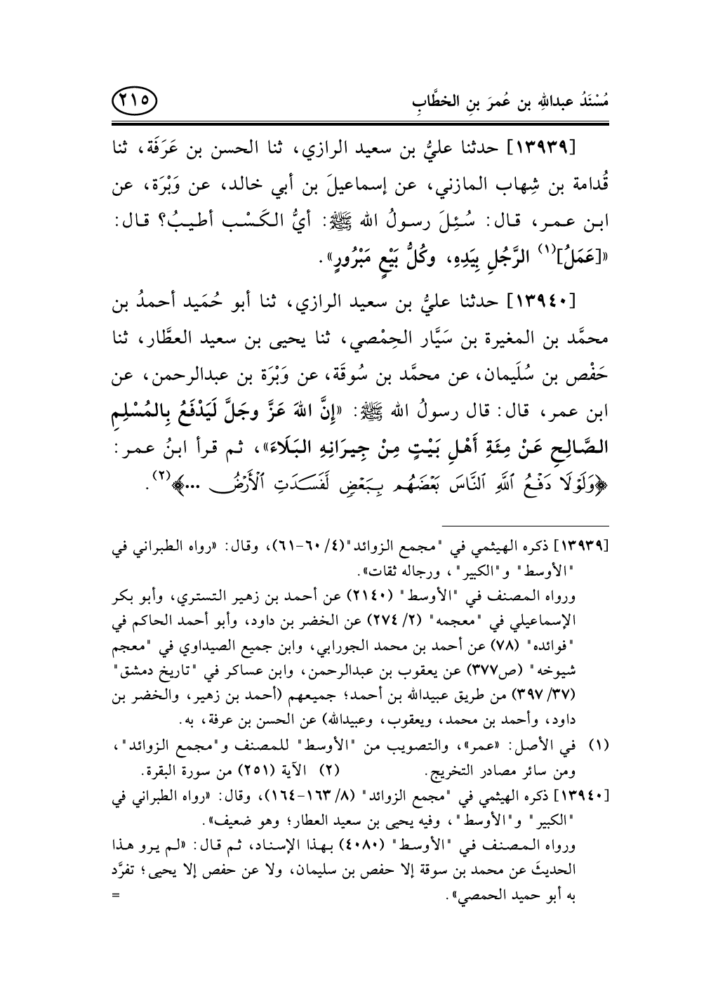 13939 - حدثنا عليُّ بن سعيد الرازي، ثنا الحسن بن عَرَفَة، ثنا قُدامة بن شِهاب المازني، عن إسماعيلَ بن أبي خالد، عن وَبْرَة، عن ابن عمر، قال: سُئِلَ رسولُ الله صلى الله عليه وسلم: أيُّ الكَسْب أطيبُ؟ قال: « [عَمَلُ] (¬1) الرَّجُلِ بِيَدِهِ، وكُلُّ بَيْعٍ مَبْرُورٍ» .