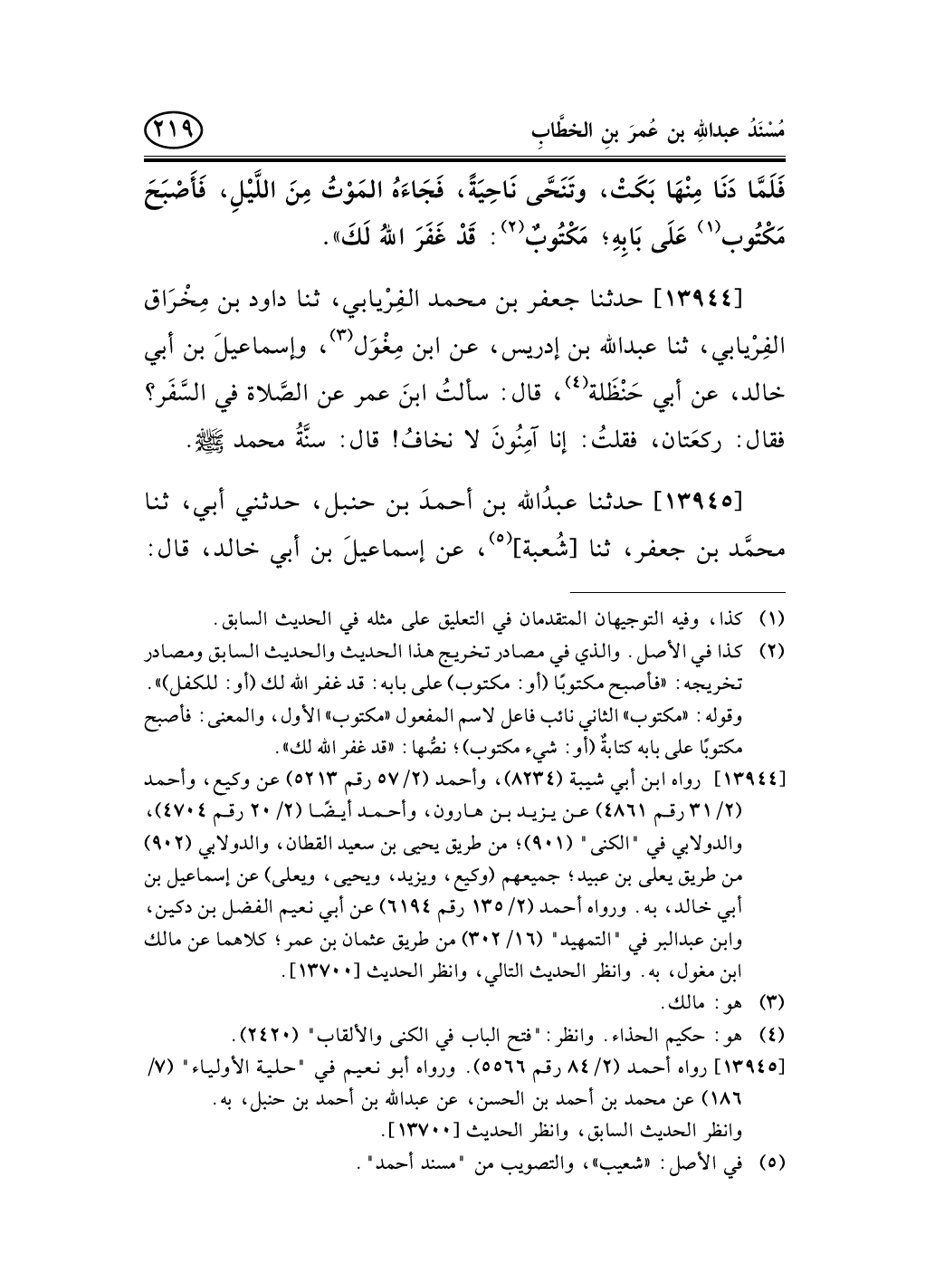 13945 - حدثنا عبدُالله بن أحمدَ بن حنبل، حدثني أبي، ثنا محمَّد بن جعفر، ثنا [شُعبة] (¬1) ، عن إسماعيلَ بن أبي خالد، قال: -[220]- سمعتُ حكيمً (¬2) الحذَّاءَ (¬3) يقول: سمعتُ ابنَ عمر سُئل عن الصلاة في السَّفَر؟ فقال: ركعتَيْن (¬4) ؛ سنَّةُ رسول الله صلى الله عليه وسلم.