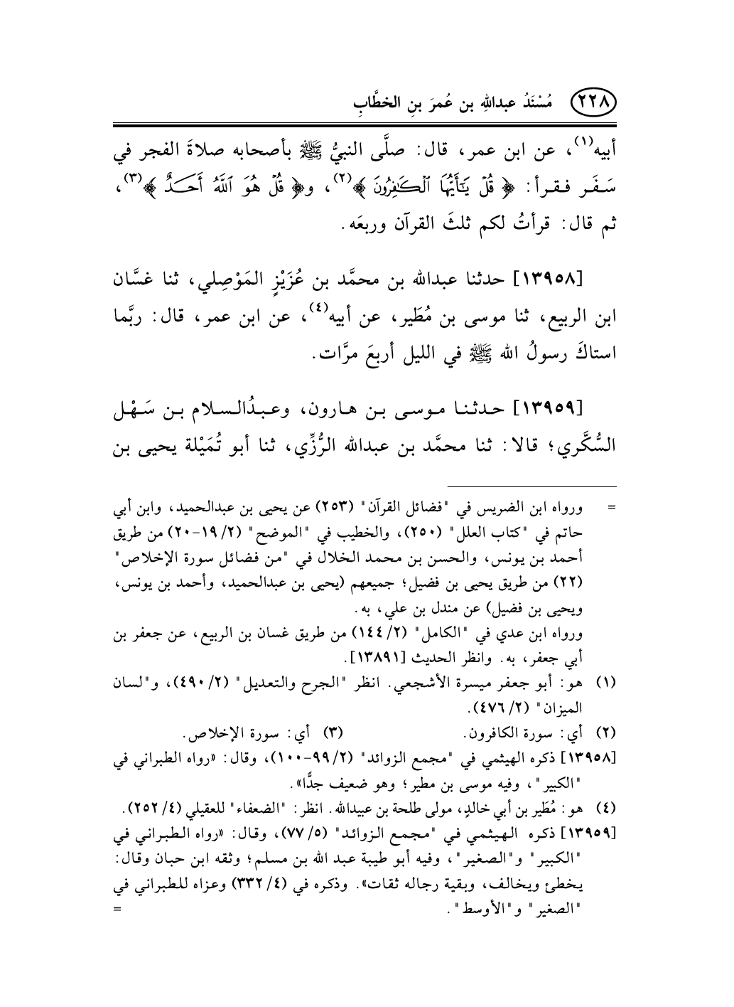 13958 - حدثنا عبد الله بن محمَّد بن عُزَيْزٍ المَوْصِلي، ثنا غسَّان ابن الربيع، ثنا موسى بن مُطَير، عن أبيه (¬1) ، عن ابن عمر، قال: ربَّما استاكَ رسولُ الله صلى الله عليه وسلم في الليل أربعَ مرَّات.