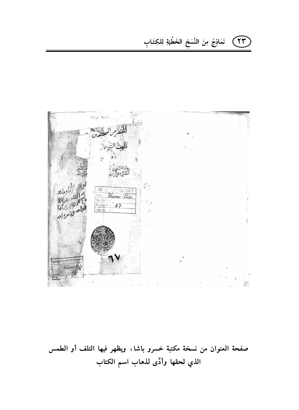 صفحة العنوان من نسخة مكتبة خسرو باشا، ويظهر فيها التلف أو الطمس الذي لحقها وأدَّى لذهاب اسم الكتاب