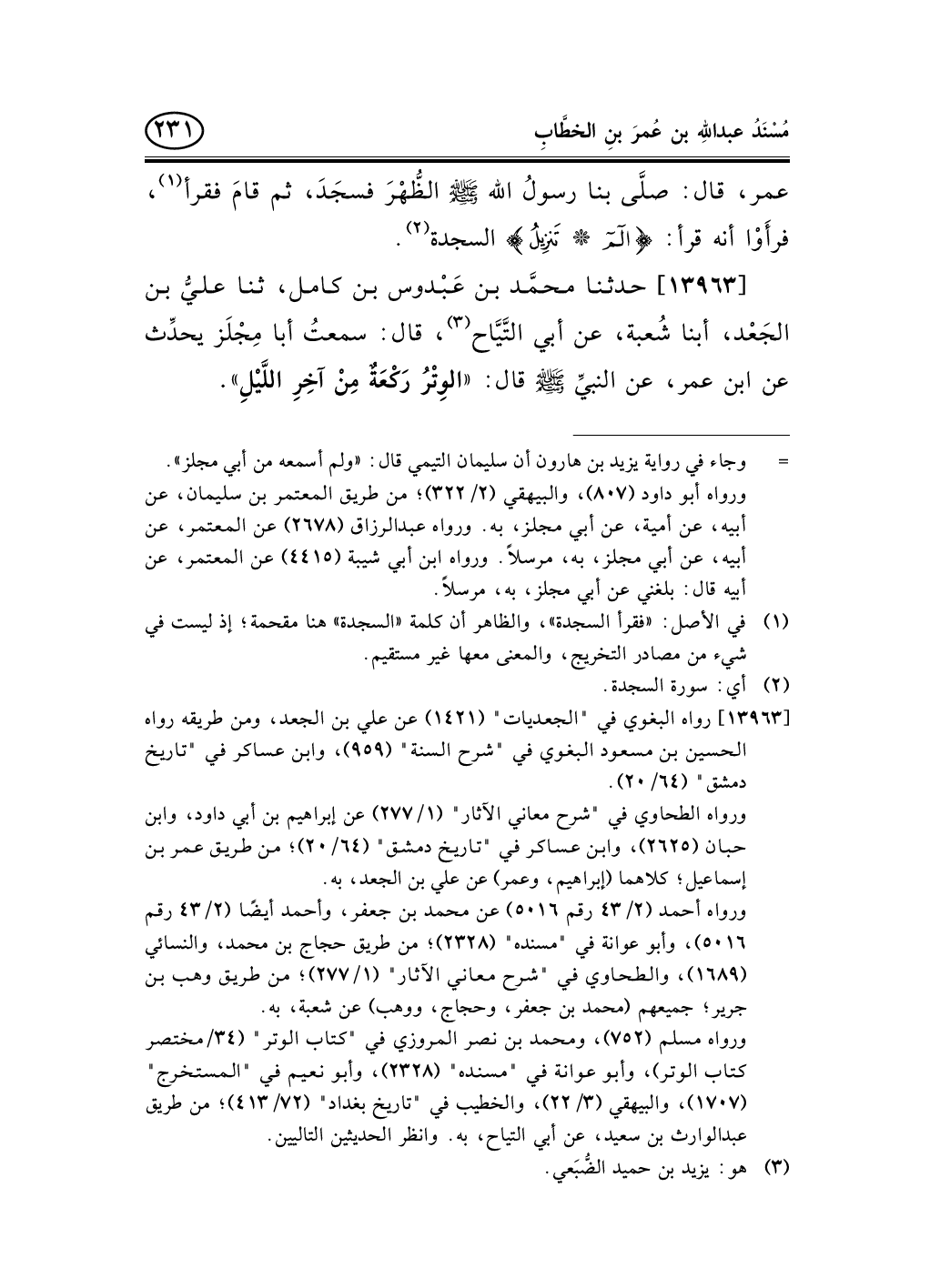 13963 - حدثنا محمَّد بن عَبْدوس بن كامل، ثنا عليُّ بن الجَعْد، أبنا شُعبة، عن أبي التَّيَّاح (¬1) ، قال: سمعتُ أبا مِجْلَز يحدِّث عن ابن عمر، عن النبيِّ صلى الله عليه وسلم قال: «الوِتْرُ رَكْعَةٌ مِنْ آخِرِ اللَّيْلِ» .