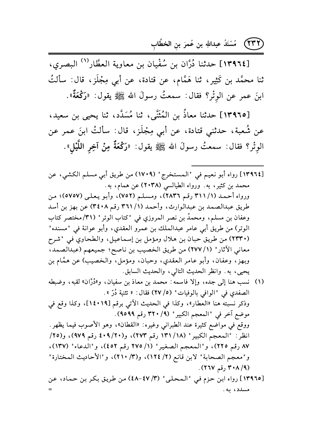 13964 - حدثنا دُرَّان بن سُفْيان بن معاوية العطَّار (¬1) البصري، ثنا محمَّد بن كَثِير، ثنا هَمَّام، عن قتادة، عن أبي مِجْلَز، قال: سألتُ ابنَ عمر عن الوِتْر؟ فقال: سمعتُ رسولَ الله صلى الله عليه وسلم يقول: «رَكْعَةٌ» .