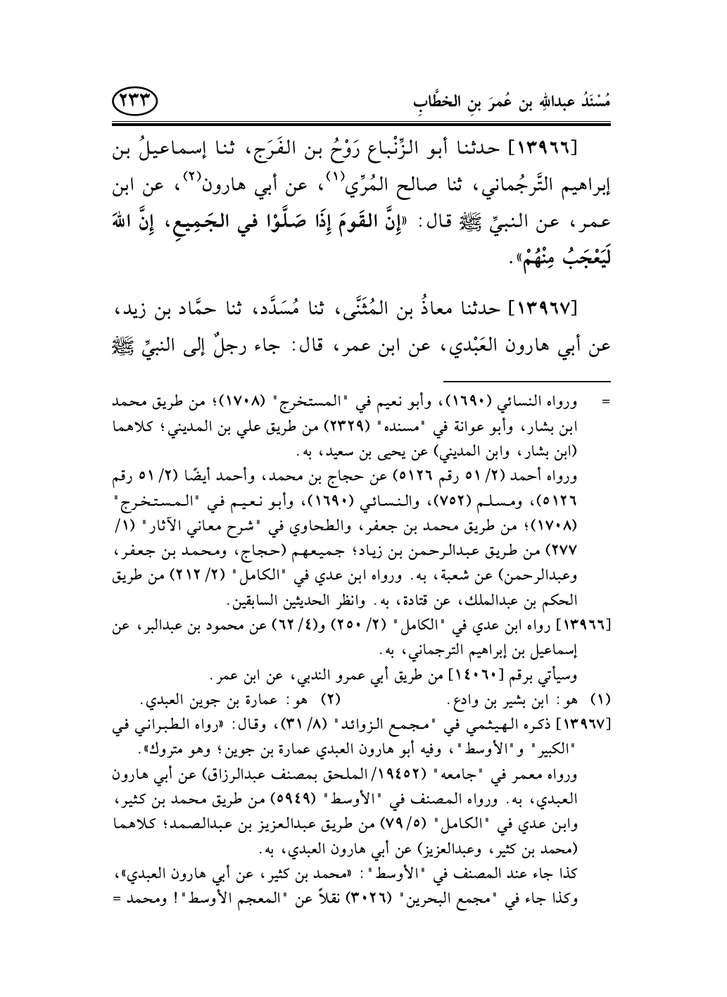 13966 - حدثنا أبو الزِّنْباع رَوْحُ بن الفَرَج، ثنا إسماعيلُ بن إبراهيم التَّرجُماني، ثنا صالح المُرِّي (¬1) ، عن أبي هارون (¬2) ، عن ابن عمر، عن النبيِّ صلى الله عليه وسلم قال: «إِنَّ القَومَ إِذَا صَلَّوْا في الجَمِيعِ، إِنَّ اللهَ لَيَعْجَبُ مِنْهُمْ» .