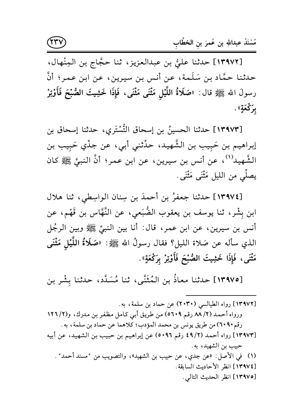 13973 - حدثنا الحسينُ بن إسحاق التُّسْتَري، حدثنا إسحاق بن إبراهيم بن حَبِيب بن الشَّهيد، حدِّثني أبي، عن جدِّي حَبِيب بن الشَّهيد (¬1) ، عن أنس بن سيرين، عن ابن عمر؛ أنَّ النبيَّ صلى الله عليه وسلم كان يصلِّي من الليل مَثْنَى مَثْنَى.