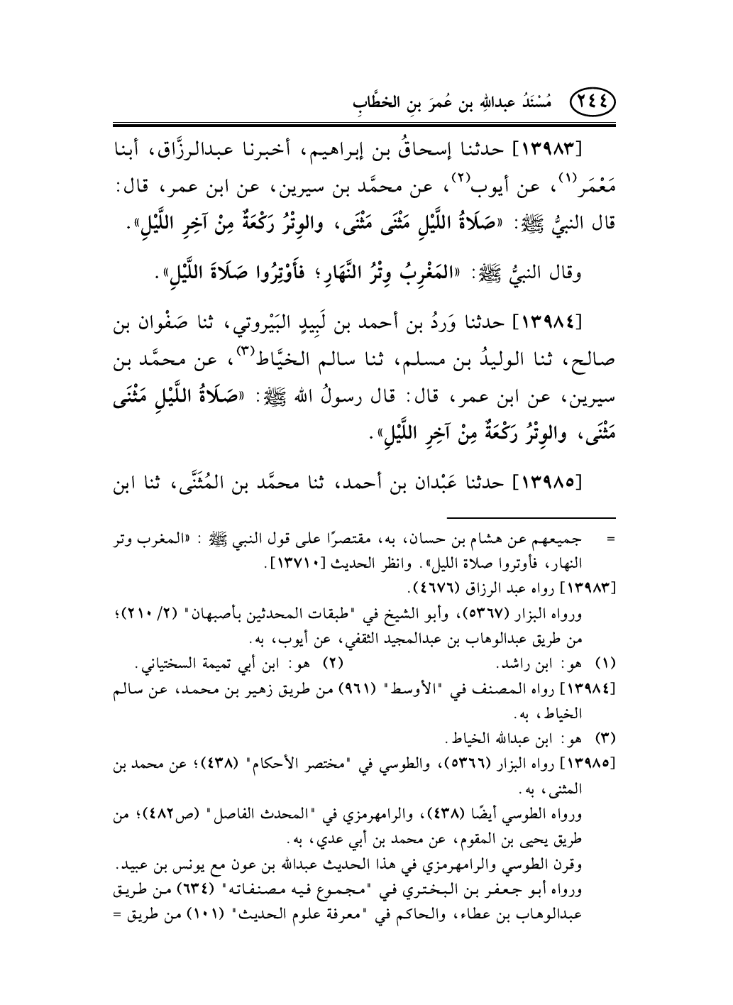 13983 - حدثنا إسحاقُ بن إبراهيم، أخبرنا عبد الرزَّاق، أبنا مَعْمَر (¬1) ، عن أيوب (¬2) ، عن محمَّد بن سيرين، عن ابن عمر، قال: قال النبيُّ صلى الله عليه وسلم: «صَلاَةُ اللَّيْلِ مَثْنَى مَثْنَى، والوِتْرُ رَكْعَةٌ مِنْ آخِرِ اللَّيْلِ» .