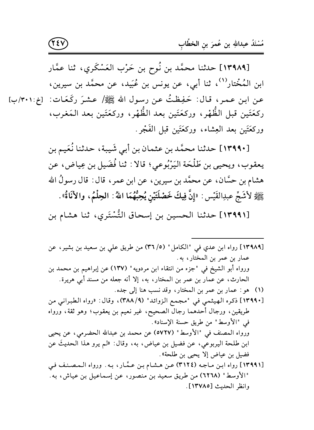 13990 - حدثنا محمَّد بن عثمان بن أبي شَيبة، حدثنا نُعَيم بن يعقوب، ويحيى بن طَلْحَة اليَرْبُوعي؛ قالا: ثنا فُضَيل بن عِياض، عن هشام بن حسَّان، عن محمَّد بن سيرين، عن ابن عمر، قال: قال رسولُ الله صلى الله عليه وسلم لأشَجِّ عبدِالقَيْس: «إِنَّ فِيكَ خَصْلَتَيْنِ يُحِبُّهُمَا اللهُ: الحِلْمُ، والأنَاةُ» .