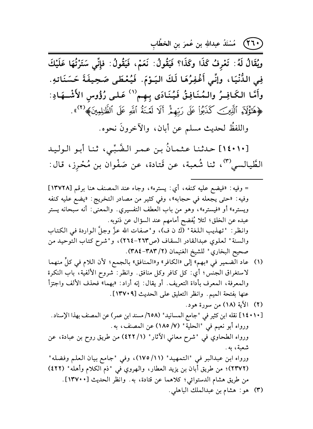 14010 - حدثنا عثمانُ بن عمر الضَّبِّي، ثنا أبو الوليد الطَّيالسي (¬1) ، ثنا شُعبة، عن قَتادة، عن صَفْوان بن مُحْرِز، قال: -[261]- سألتُ ابنَ عمر [عن] (¬2) الصلاةِ في السَّفَر؟ قال: ركعتان؛ مَنْ خالفَ السنَّة كَفَر.