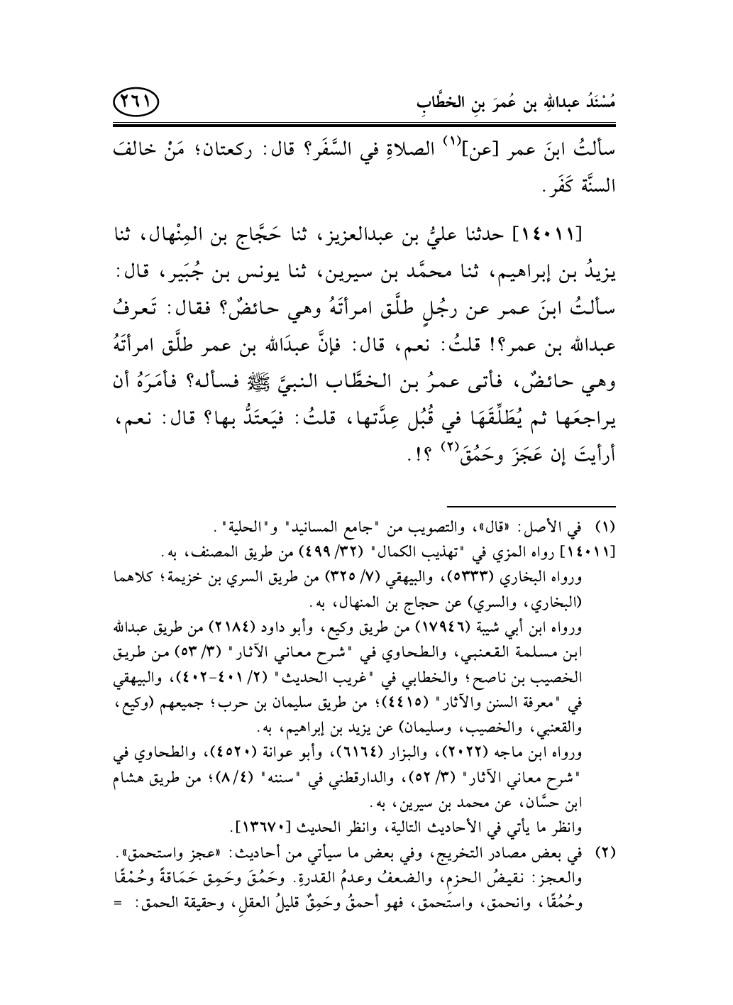 14011 - حدثنا عليُّ بن عبد العزيز، ثنا حَجَّاج بن المِنْهال، ثنا يزيدُ بن إبراهيم، ثنا محمَّد بن سيرين، ثنا يونس بن جُبَير، قال: سألتُ ابنَ عمر عن رجُلٍ طلَّق امرأتَهُ وهي حائضٌ؟ فقال: تَعرفُ عبد الله بن عمر؟! قلتُ: نعم، قال: فإنَّ عبدَالله بن عمر طلَّق امرأتَهُ وهي حائضٌ، فأتى عمرُ بن الخطَّاب النبيَّ صلى الله عليه وسلم فسأله؟ فأمَرَهُ أن يراجعَها ثم يُطَلِّقَهَا في قُبُل عِدَّتها، قلتُ: فيَعتَدُّ بها؟ قال: نعم، أرأيتَ إن عَجَزَ وحَمُقَ (¬1) ؟!.