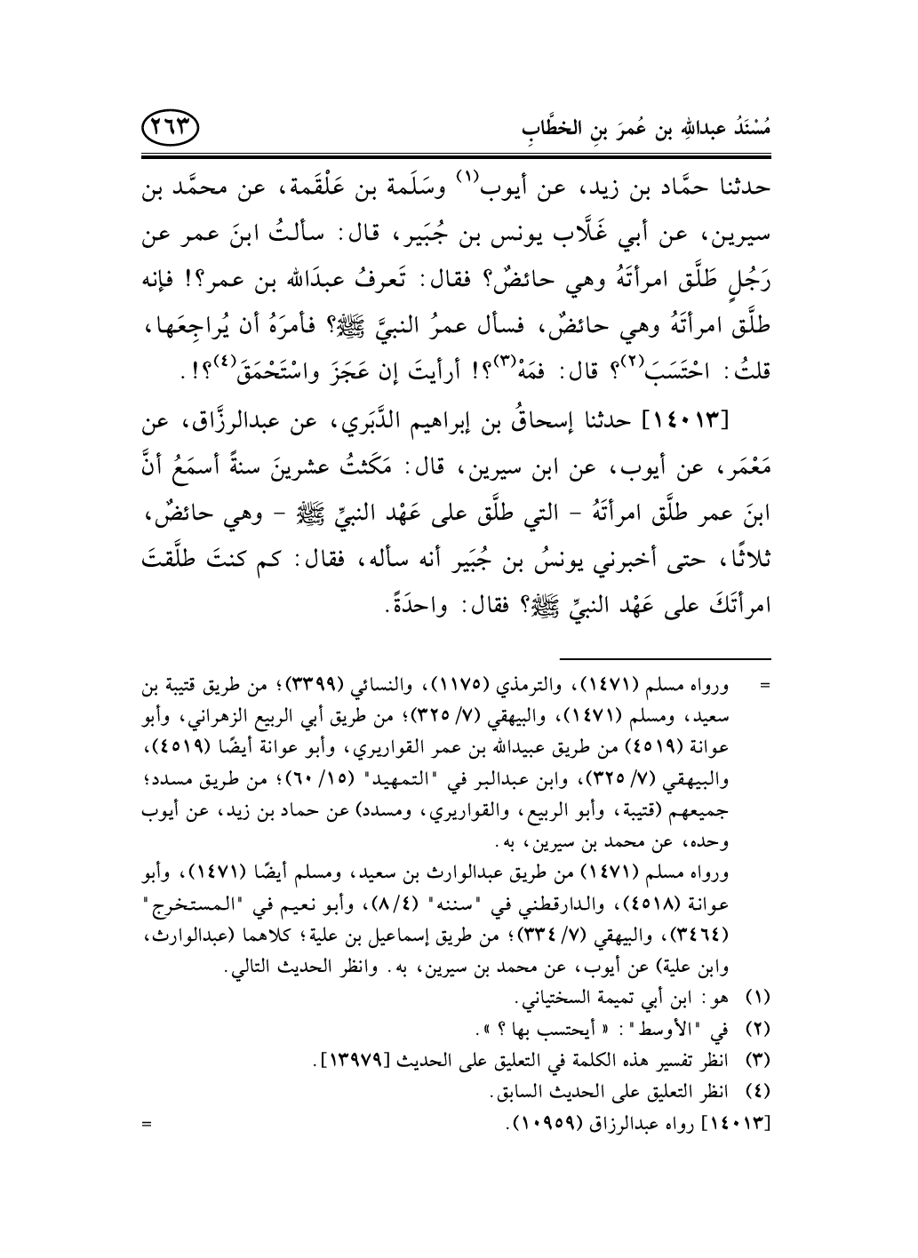 14013 - حدثنا إسحاقُ بن إبراهيم الدَّبَري، عن عبد الرزَّاق، عن مَعْمَر، عن أيوب، عن ابن سيرين، قال: مَكَثتُ عشرينَ سنةً أسمَعُ أنَّ ابنَ عمر طلَّق امرأتَهُ - التي طلَّق على عَهْد النبيِّ صلى الله عليه وسلم - وهي حائضٌ، ثلاثًا، حتى أخبرني يونسُ بن جُبَير أنه سأله، فقال: كم كنتَ طلَّقتَ امرأتَكَ على عَهْد النبيِّ صلى الله عليه وسلم؟ فقال: واحدَةً.