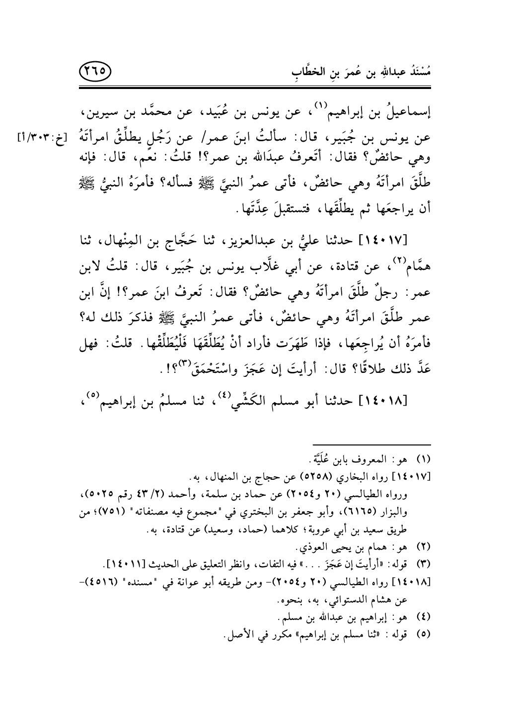 14018 - حدثنا أبو مسلم الكَشِّي (¬1) ، ثنا مسلمُ بن إبراهيم (¬2) ، -[266]- ثنا هشام الدَّسْتَوائي، ثنا قَتادة، عن يونس بن جُبَير؛ أنَّ رجلاً سأل ابنَ عمر عن رجُلٍ طلَّق امرأتَهُ وهي حائضٌ؟ فقال: تَعرفُ ابنَ عُمَر؟! طلَّقَ امرأتَهُ وهي حائضٌ، فسأل عمرُ النبيَّ صلى الله عليه وسلم عن ذلك؟ فقال: «تُمْسِكُ عَلَيْكَ، فَإِذَا طَهَرَتْ فَإِنْ شَاءَ أَمْسَكَ، وإِنْ شَاءَ طَلَّقَ» (¬3) ، قلتُ: تَعتَدُّ بتلك التَّطليقَة؟ قال: فمَهْ (¬4) ؟! أرأيتَ إن عَجَزَ أو حَمُقَ (¬5) ؟!