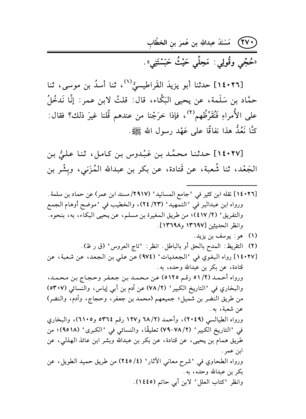 14026 - حدثنا أبو يزيدَ القَراطيسيُّ (¬1) ، ثنا أسدُ بن موسى، ثنا حمَّاد بن سَلَمة، عن يحيى البَكَّاء، قال: قلتُ لابن عمر: إنَّا نَدخُلُ على الأُمراءِ فَنُقَرِّظُهم (¬2) ، فإذا خرَجْنا من عندهم قُلنا غيرَ ذلك؟ فقال: كنَّا نَعُدُّ هذا نفاقًا على عَهْد رسول الله صلى الله عليه وسلم.