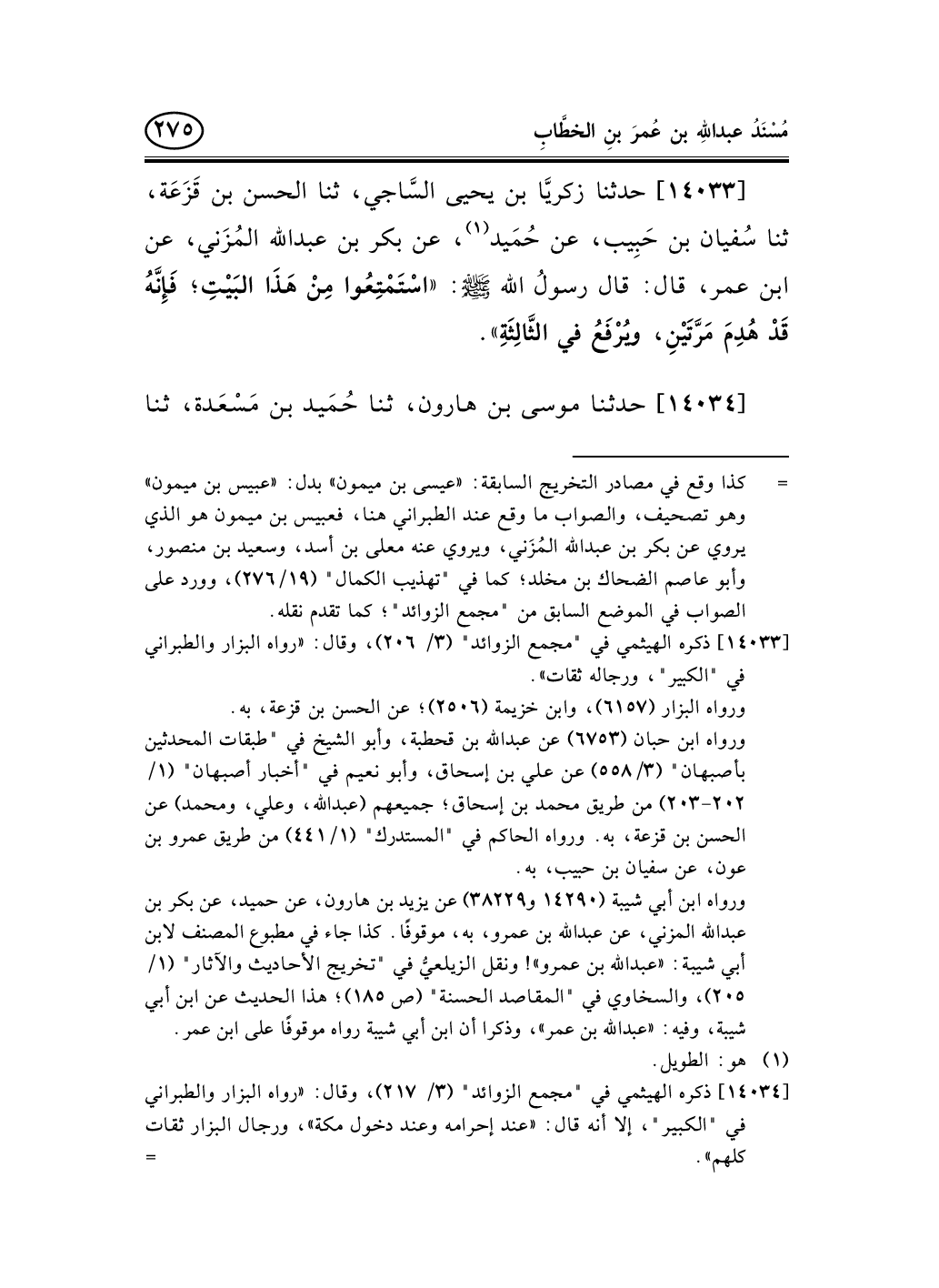 14033 - حدثنا زكريَّا بن يحيى السَّاجي، ثنا الحسن بن قَزَعَة، ثنا سُفيان بن حَبِيب، عن حُمَيد (¬1) ، عن بكر بن عبد الله المُزَني، عن ابن عمر، قال: قال رسولُ الله صلى الله عليه وسلم: «اسْتَمْتِعُوا مِنْ هَذَا البَيْتِ؛ فَإِنَّهُ قَدْ هُدِمَ مَرَّتَيْنِ، ويُرْفَعُ في الثَّالِثَةِ» .